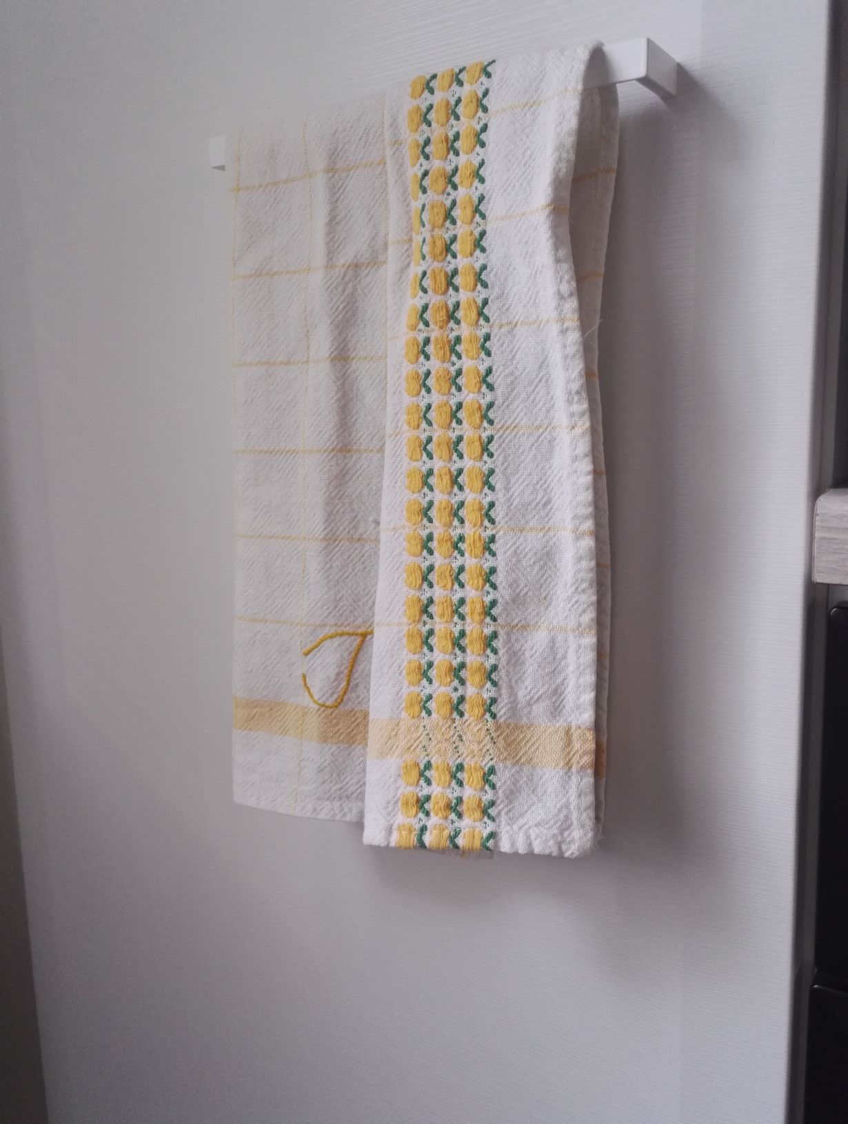 Rakkain keittiöpyyhkeeni on mummulta saatu. Käsityöihmisenä mummu usein antoi nimikirjaimin koristeltuja käsitöitä, niin tässäkin omppupyyhkeessä on T niinkuin Tiina. Mummu on läsnä keittiössäni.