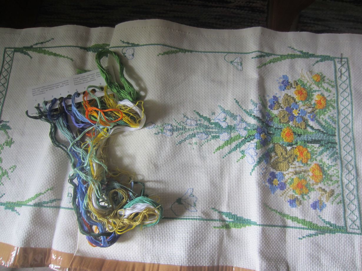 Kun aloitin tämän kauniin pöytäliinan tekemisen, tarkoituksena oli antaa se toiseksi vanhimmalle tyttärelle 30- vuotislahjaksi. Tänään tytär täyttää 43 ja liina on tässä vaiheessa vieläkin.