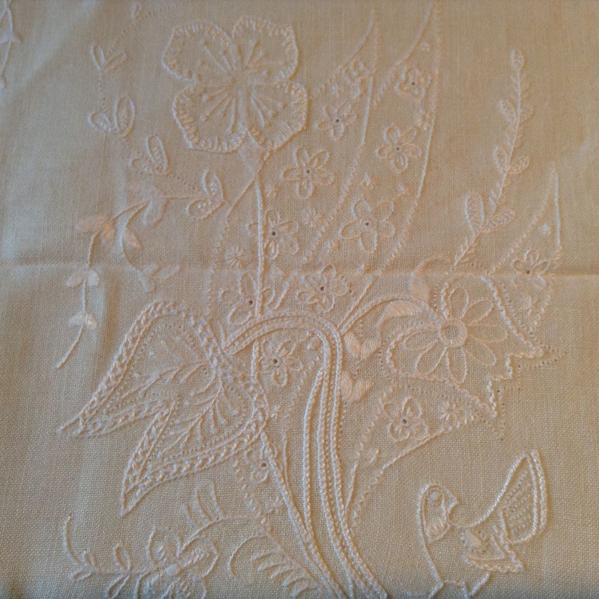 Olen itse kirjaillut tämän vuonna 1950 kasteliinaksi. Tämä kuvio on osa liinan keskustakuviota. Liinaa on käytetty kaikkien 8 lapsen kastejuhlassa.