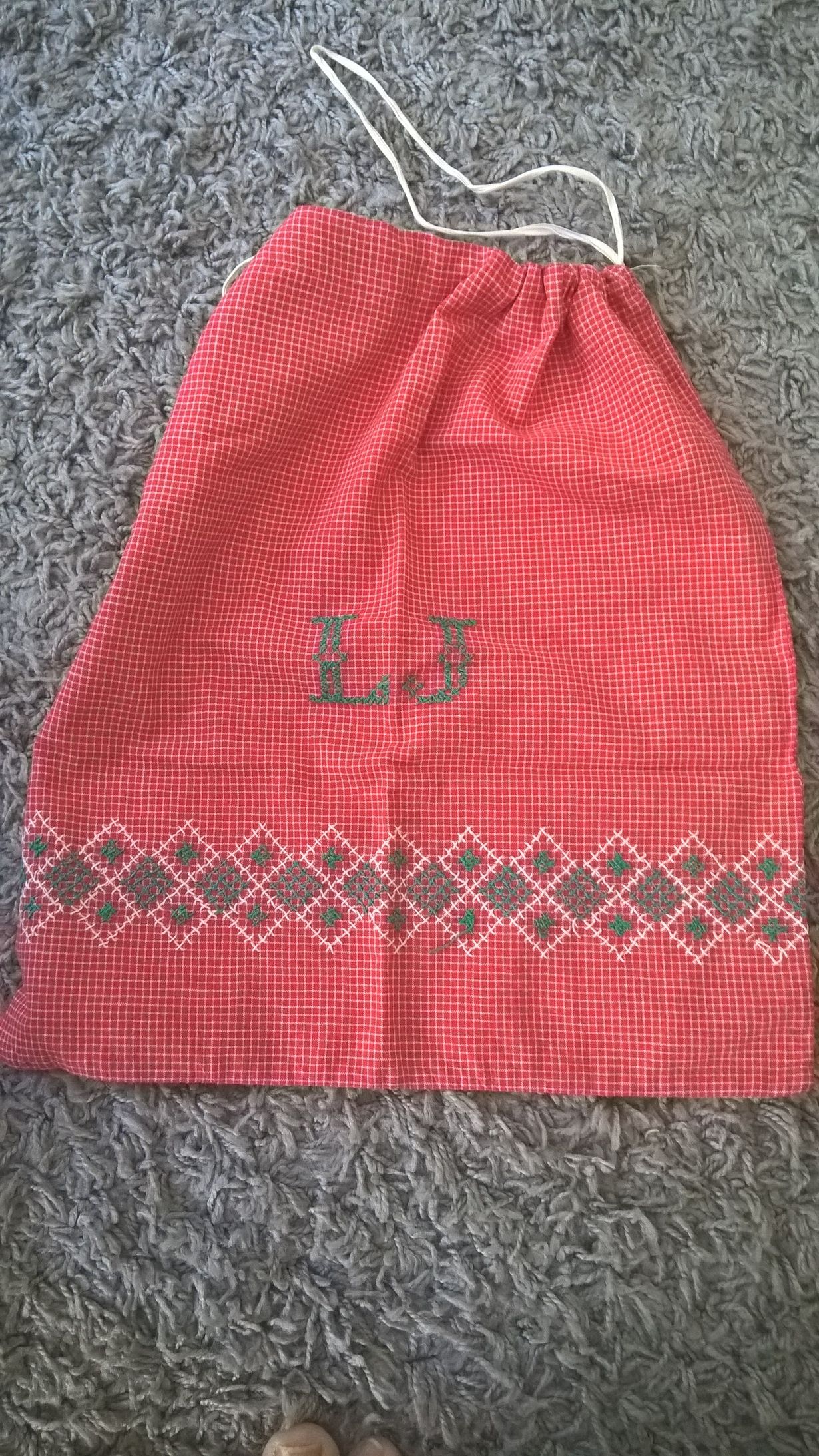 Kansakoulun , olisko kolmannella luokalla tehty käsityöpussi. Nyt olen itse jo eläkkeellä. Pussin sisällä tiedot kuka tehnyt, ehkä jälkipolvet säilyttävät. Myöhemmin olen tehnyt paljon merkkaustöitä ja kanavatöitä. Käsitöitä yleensäkin paljon.