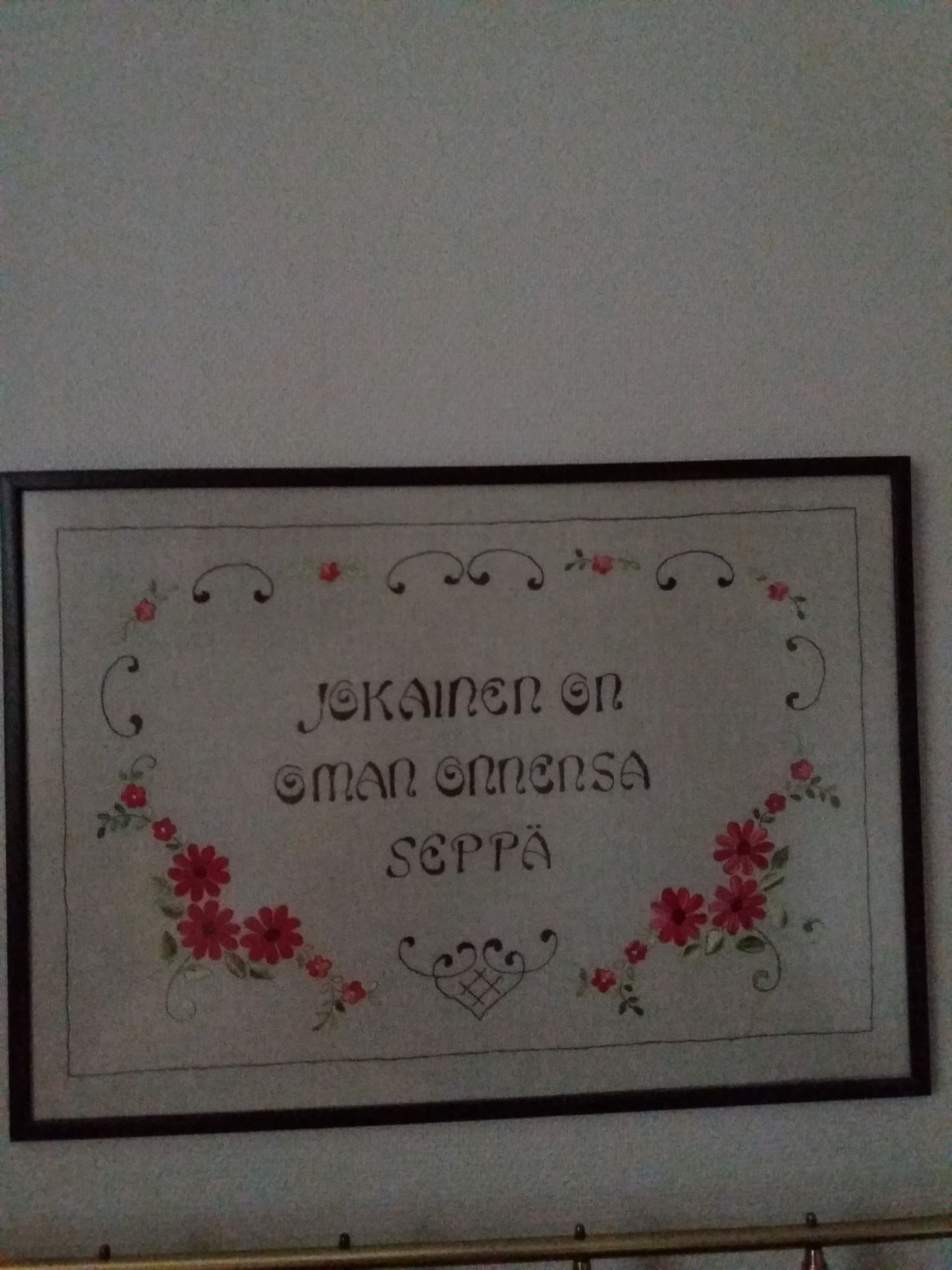 Tämän kirjailutyön sain ex-anopiltani lahjaksi, kun minulle ja ex- miehelleni tuli ero. Ompelin sen itse valmiiksi ja vein kehystettäväksi. Nykyisin se on makuuhuoneeni seinällä.