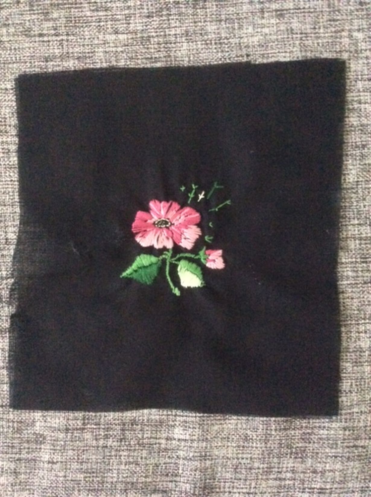 Tämä kirjailemani tilkku on kulkenut mukanani 70-luvun alkupuolelta saakka. Harjoittelin tällöin kirjomista, mutta tähän se melkein jäi. Ehkä tilkku vielä löytää paikkansa.