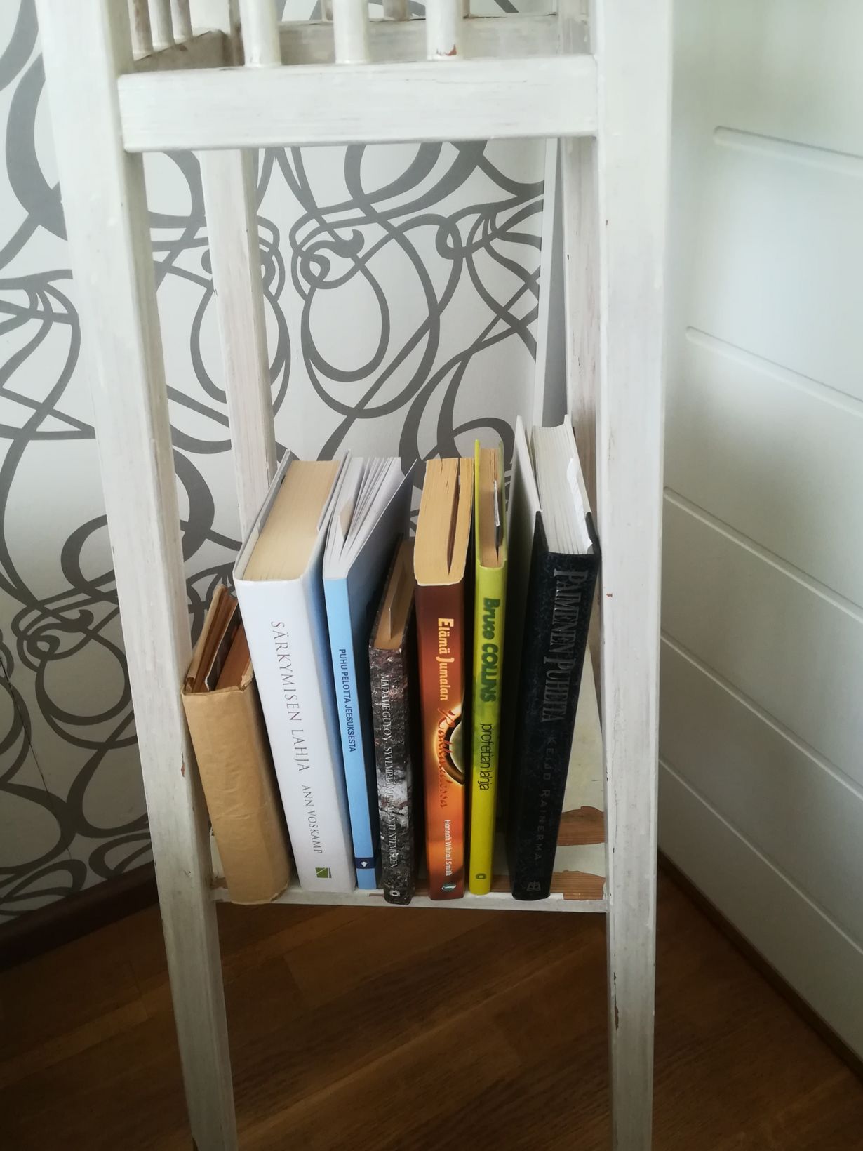 Pienen pieni kirjasto on muodostunut vanhaan kukkapylvääseen vuoteeni viereen. Joka ilta luen jotain näistä kirjoista. Kaikki ovat minulle rakkaita. Valintani tapahtuu tilanteen ja mielialani mukaan. Näistä saan voimaa, lohdutusta, rauhaa ja levollista unta.