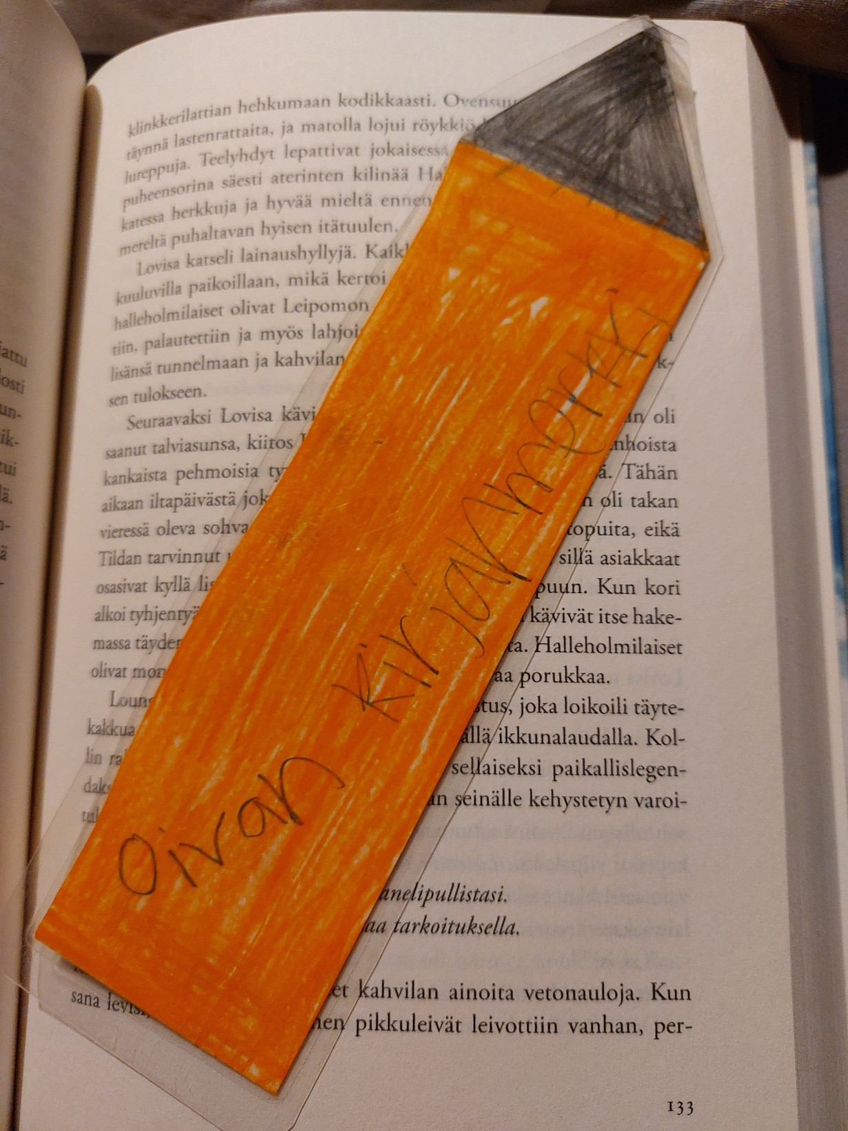 Lapseni askarteli kirjanmerkin jo vuosia sitten koulussa ja antoi sen käyttööni kun ei sitä enää itse tarvinnut. Merkki ilahduttaa minua kirjan välissä päivittäin.