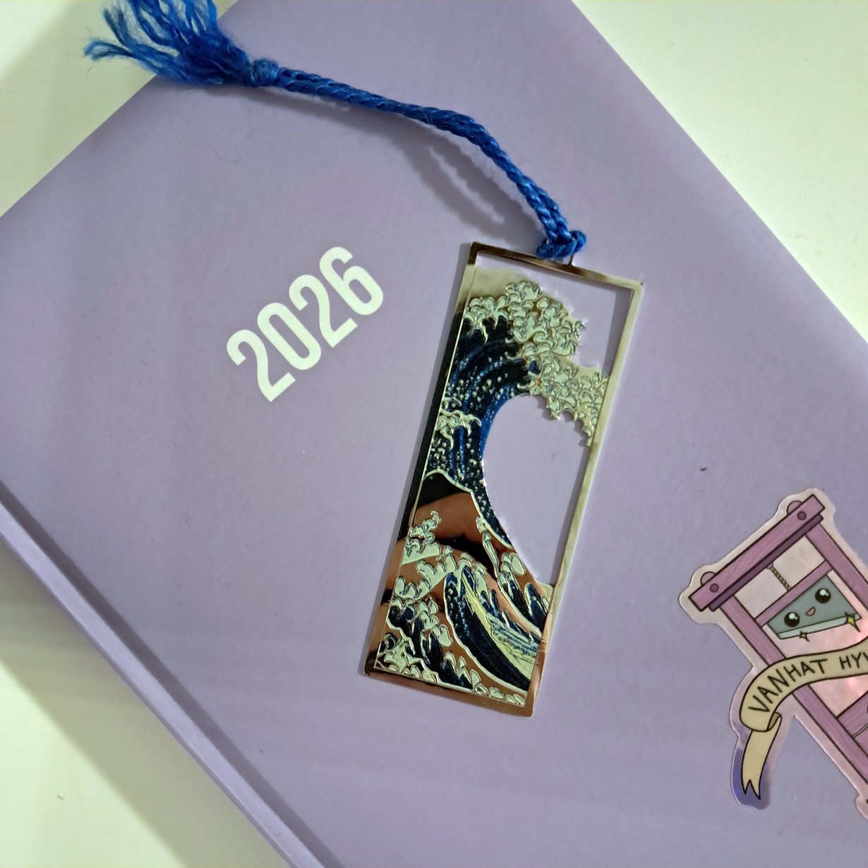 Sain metallisen kirjanmerkin kalenterini väliin siskoltani British Museumin tuliaisena. Merkissä on lempi puupiirrokseni Hokusain The great wave.