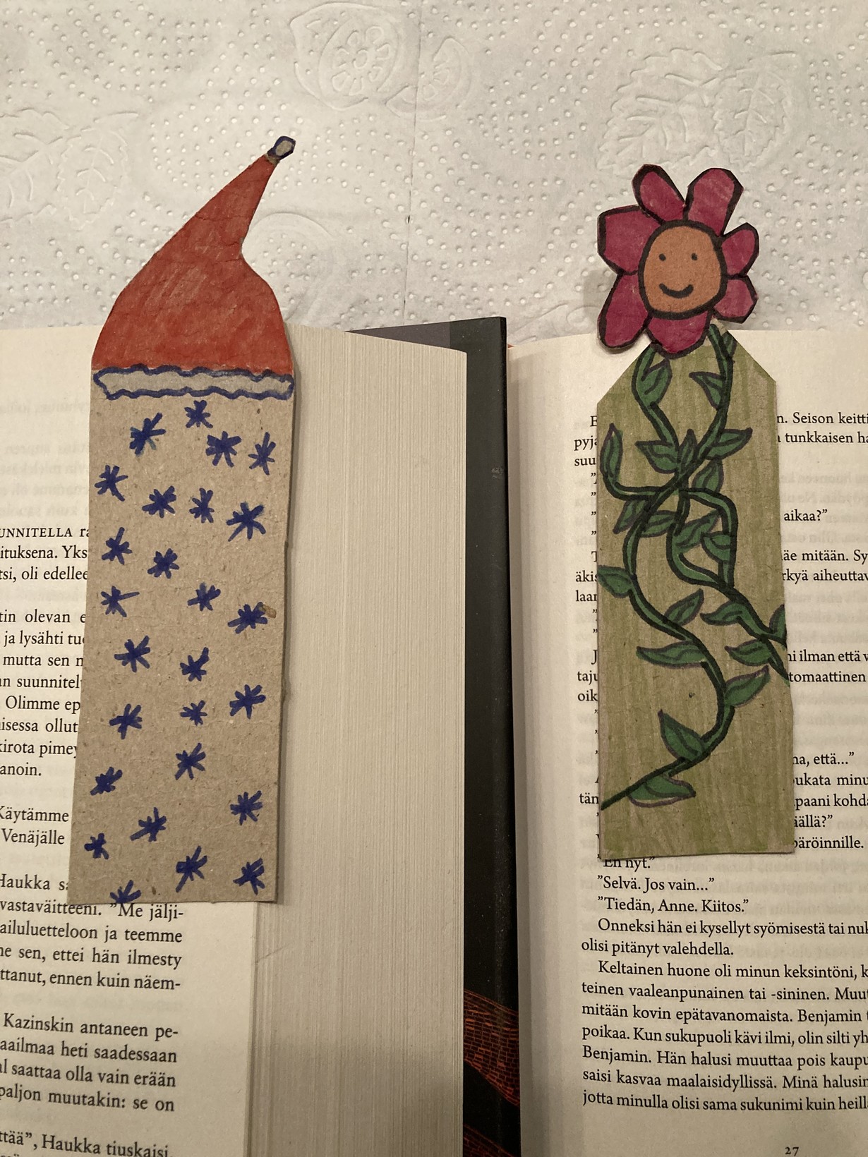 Meidän ainut ihana lapsenlapsi Iines teki 10-vuotiaana mummille ja papalle joululahjaksi kirjanmerkit. Näin lukuharrastus suvussa pysyy.