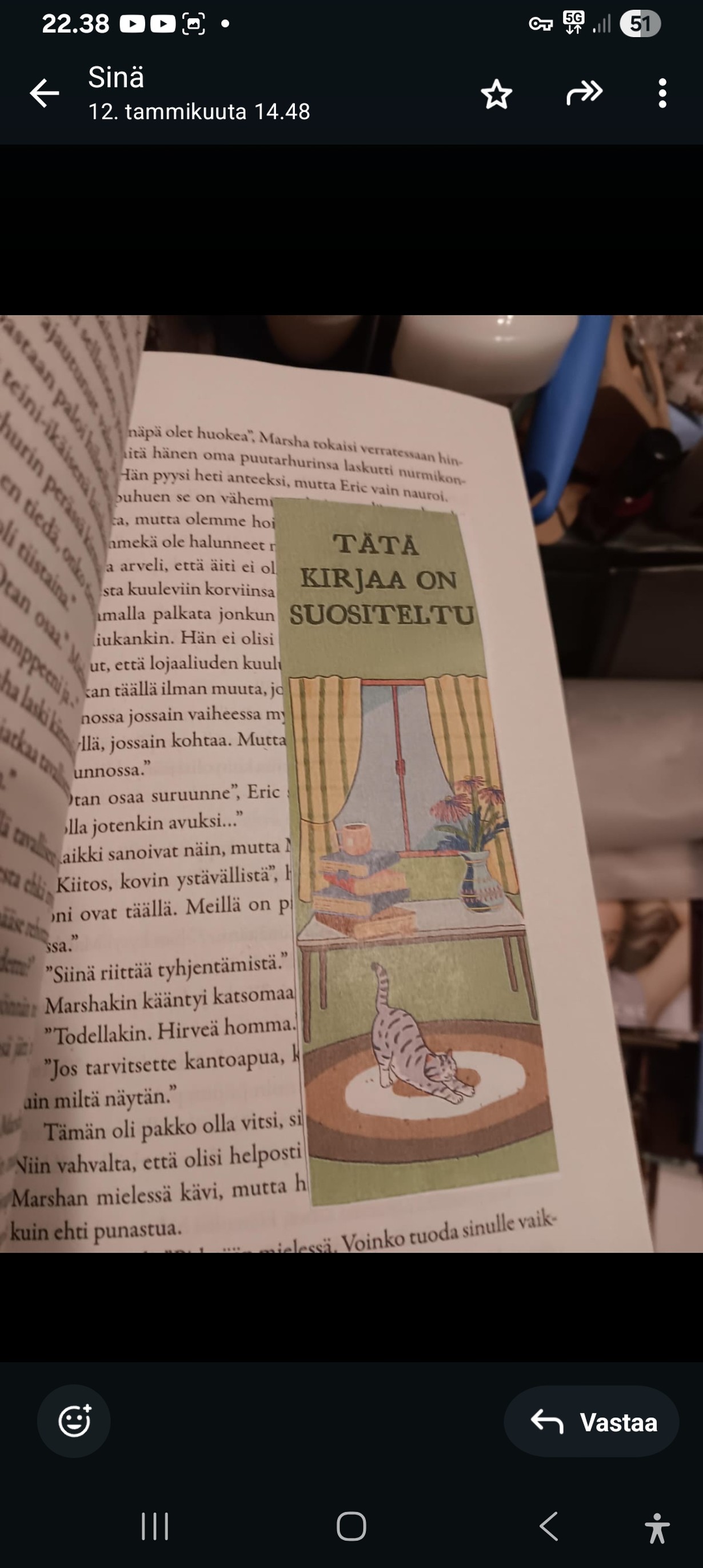 Lähetä kuvakisaan kuva kirjanmerkistäsi - voita Jokipiin Pellavan torkkupeitto ja tyyny Kirjanmerkki Sarkku 19.1.2026 klo 22:52