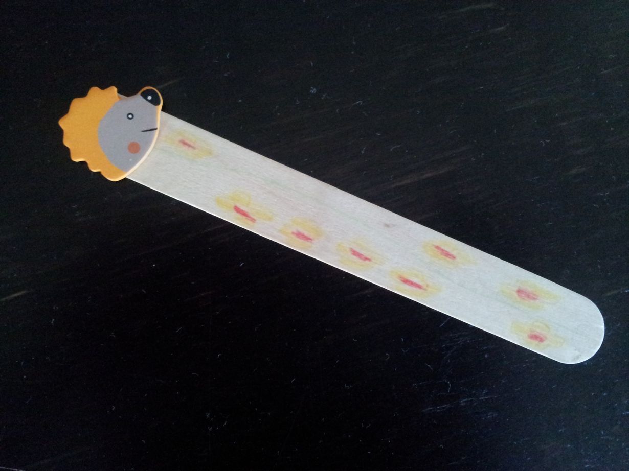 Poikani teki vuosia sitten ekaluokkalaisena tämän kirjanmerkin. Varteen piirretyt hellyttävät kukkaset ovat kovassa käytössä lähes poiskuluneet.