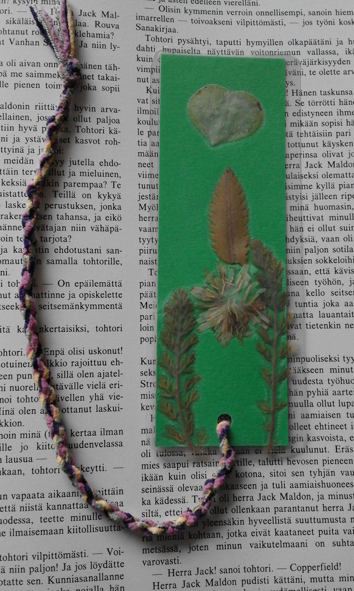 Sain kirjanmerkin tyttärenpojaltani toppuluokan loputtua keväällä. Hän oli tehnyt sen minulle,kirjanmerkin kääntöpuolella lukee tikkukirjaimin mummu. Hän kertoi antaessaan että siinä on niinkuin portti ja siitä mennään ja sitten siellä on sydän. Kirjanmerkki on laminoitu ja tukeva. On ihana ajatella kuinka on kerätty kasvit, kuivattu ja aseteltu ajatuksella paikoilleen.Iloitsen siitä suunnattomasti.