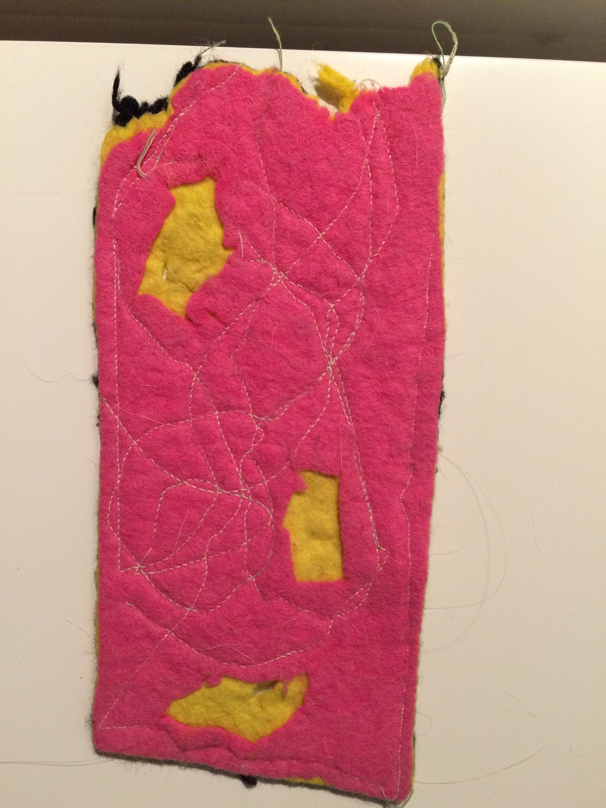 Tämän kirjanmerkin on tehnyt poikani noin 5 v sitten ala-asteella ja sain sen äitienpäivälahjaksi. Toinen puoli on musta Ja toinen pinkki. Sitä on käsitellyt myös meidän koira.