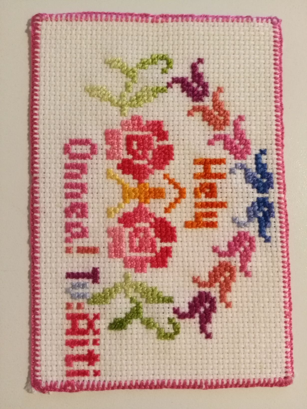 Äitini on tehnyt minulle tämän kirjanmerkin nimipäiväkseni.Se on ommeltu pienillä ristipistoilla.Tämä on minulle rakas kirjanmerkki.