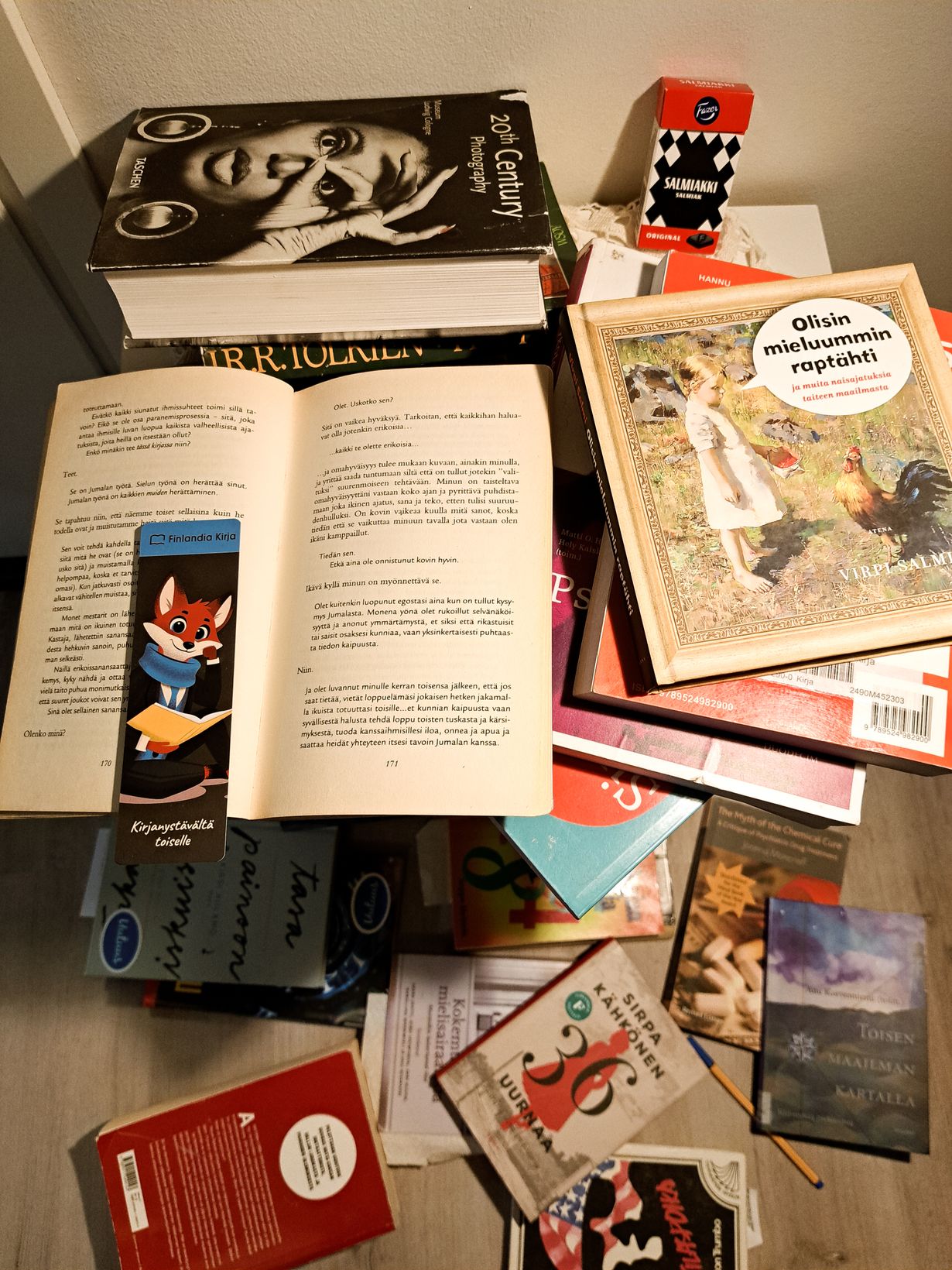 Luen todella paljon kirjoja ja yöpöytäni näyttää usein tältä. Avoinna on kirja, jota parhaillaan luen, Neale Donald Walschin "Keskusteluja Jumalan kanssa." Kuvan kirjanmerkki kertoo omaa tarinaansa "Kirjanystävältä toiselle." Kuvassa myös luottoystävä salmiakki.
