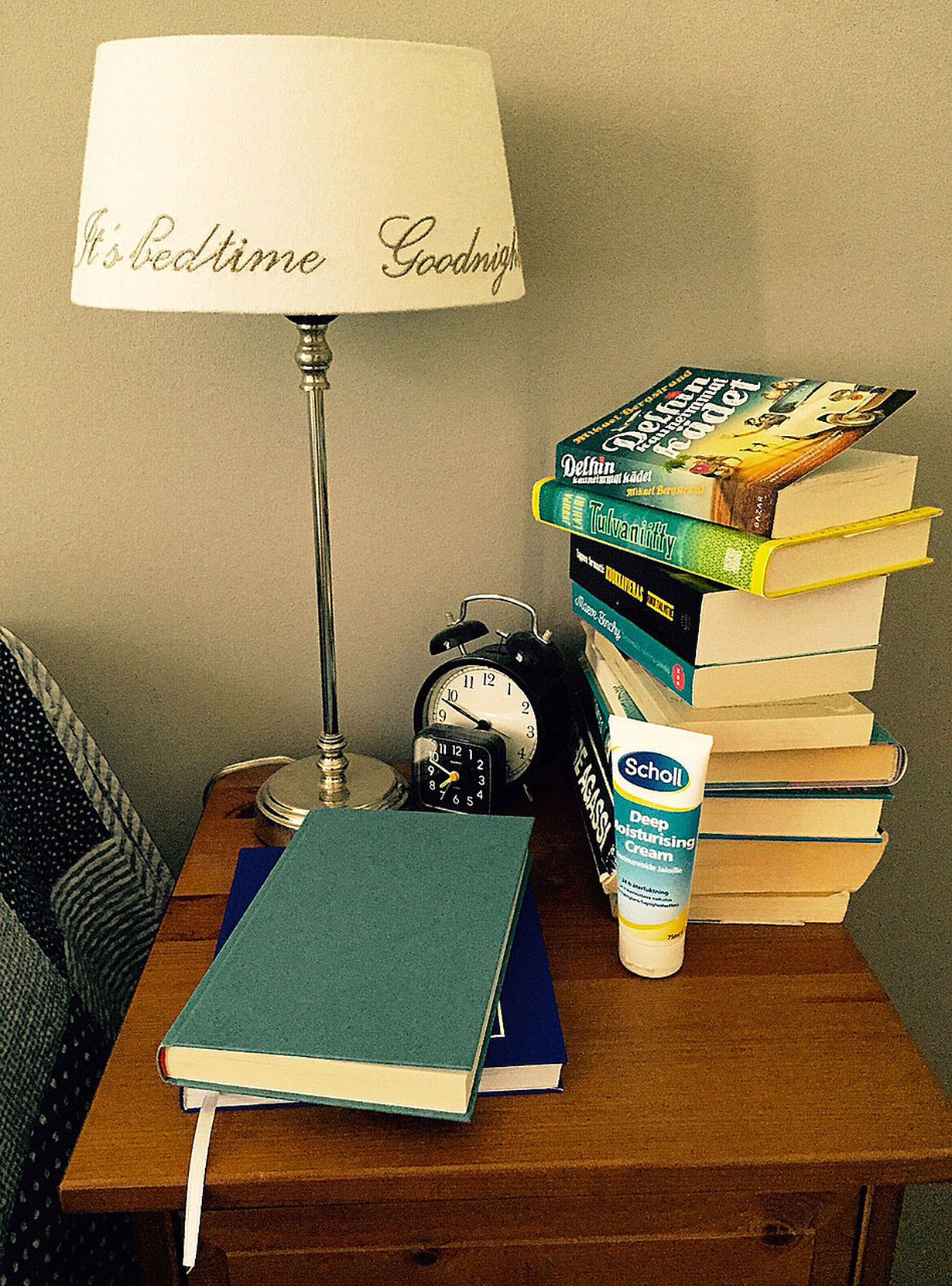 Kesäloma turvattu, kirjapino yöpöydällä riittävän korkea! Muuten kuvasta paljastuu, että välillä tarvitsen parikin kelloa, jotta aamu-unisena herään ajoissa töihin. Ja jalkavoide siirtyi yöpöydän laatikosta pöydälle esille, kun muuten aktiivisesti unohdan käyttää sitä.