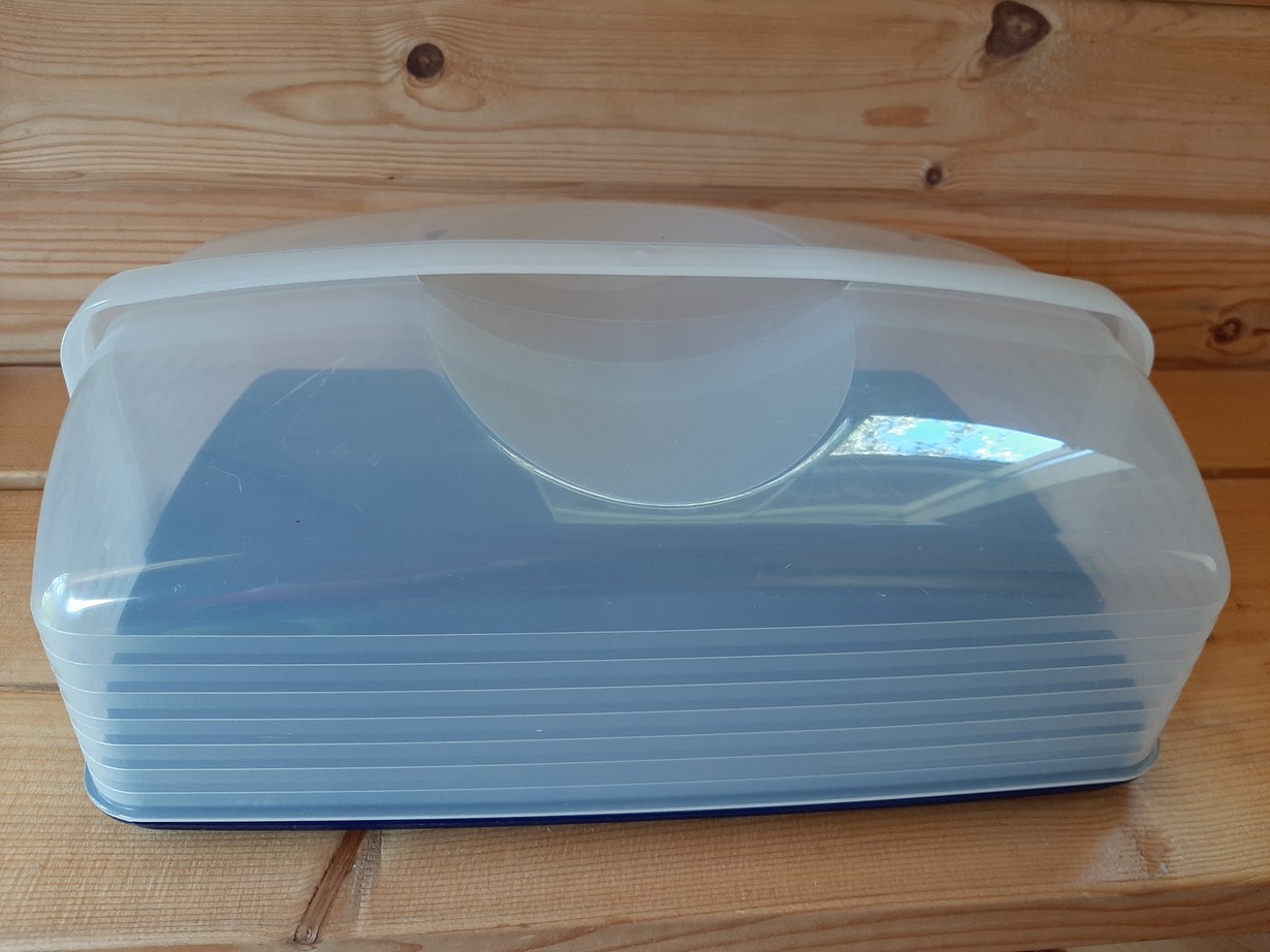 Tämän Tupperwaaran ison kakkukuvun löysin vuosia sitten kirpparilta. Olen kova leipomaan ja välillä tarvii isojakin astioita. Oli hyvä löytö, vaikka maksoikin vielä paljon, mutta taisi olla ihan uusi.