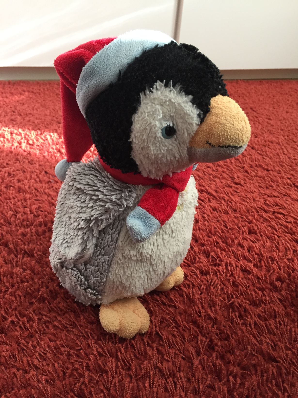 Tässä on Nuut Nuut, joka pitää tonttulakkia päässä läpi vuoden. Nuut Nuut muutti meille Saksan joulumarkkinoilta ja on saanut monta pingviinikaveria Suomesta.