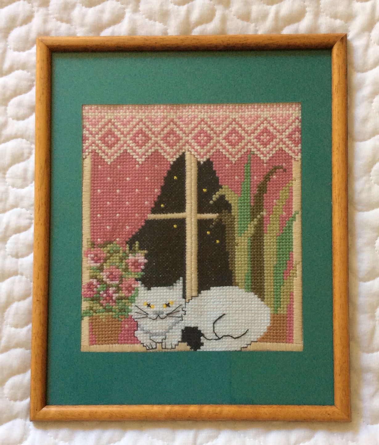 Ristipistotyön ohje on ollut Suuressa Käsityölehdessä nro 5/1993. Noina aikoina keräilin kissa-aiheisia tavaroita, joten tämä oli oiva ohje tehdä itse kissatyö keittiön seinälle. Siinä se on katsellut touhujani jo yli 20 vuotta.