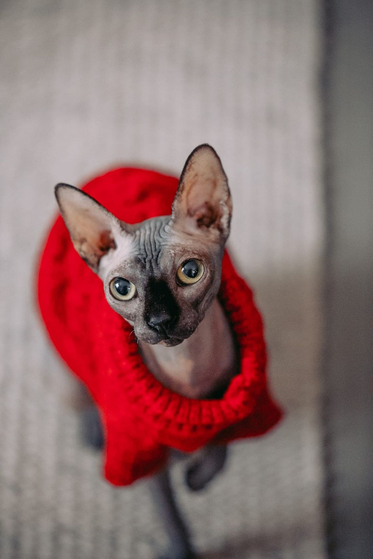 Sfinx-kissa Havu punaisessa neuleessa.