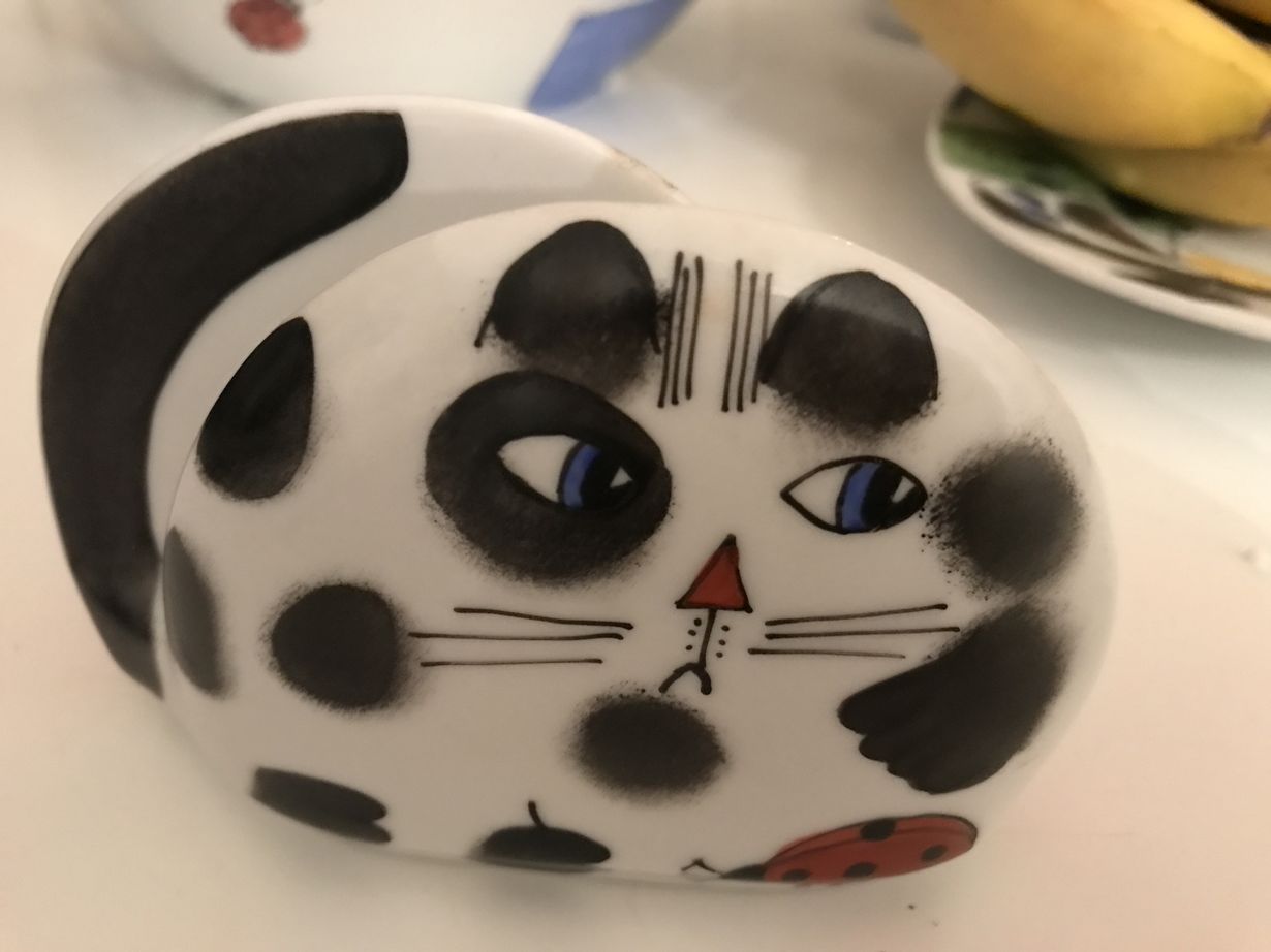 Tallinnasta ostettu Helina Tilkin kissa -aiheinen serviettiteline. Tätä samaa kissasarjaa on tullut haalittua tosi paljon. Nämä ovat hyvänmielen astioita.