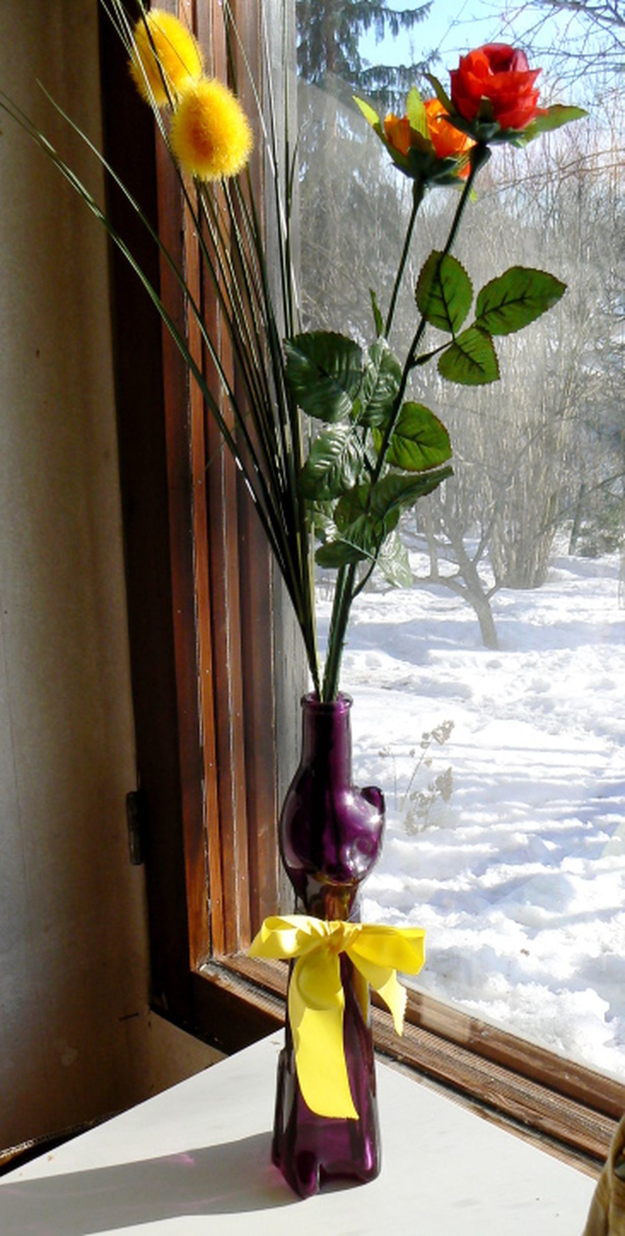 Tämä lahjaksi saamani kisu-viinipullo on aina toiminut maljakkona (siitä lähtien kun sen sain) ja vuodenajan mukaan se vaihtaa rusettia. Kukkina valitettavasti usein vain muovikukat, kuten kuvassa.