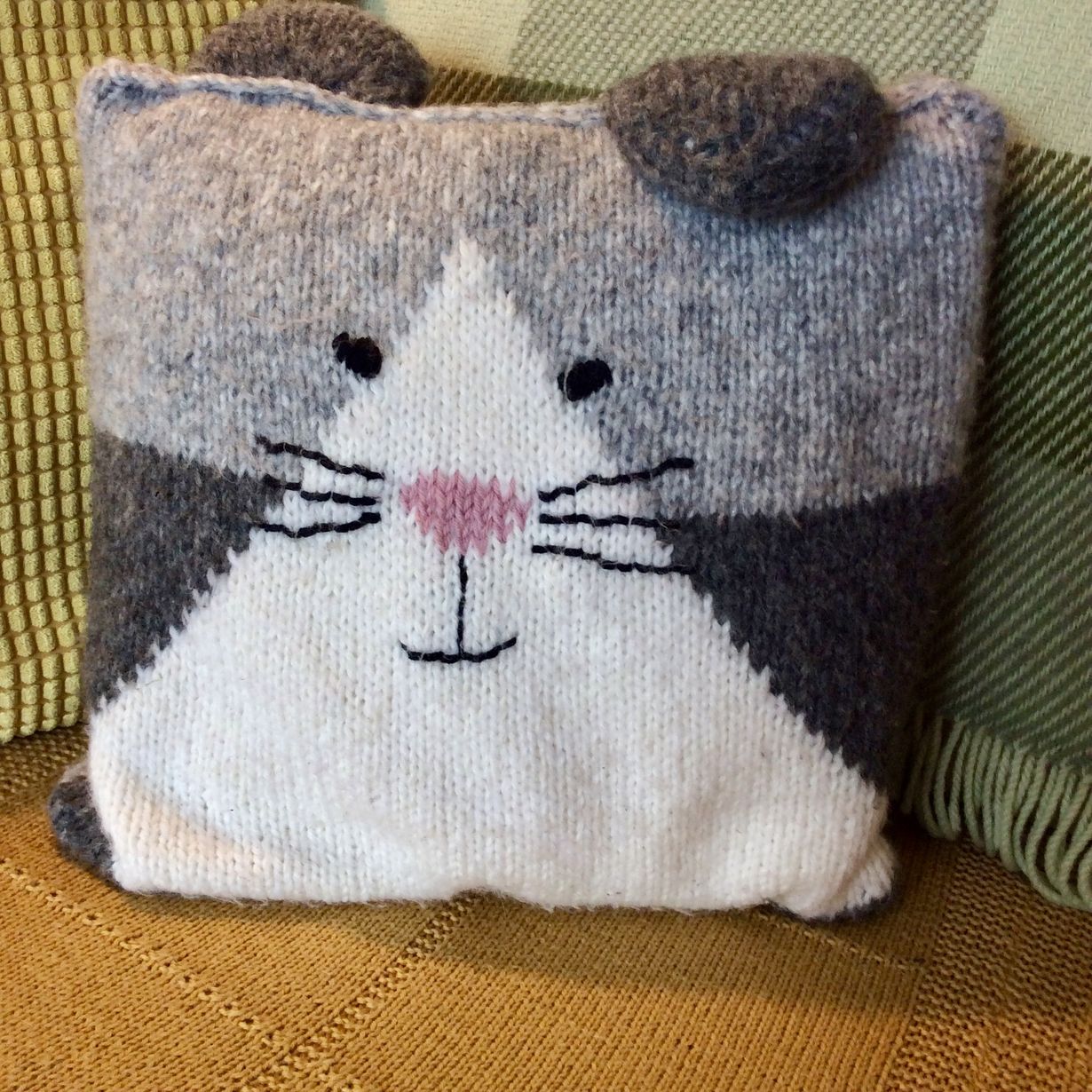 Tein kisulin jonkin lehden ohjetta soveltaen noin 40 x 40 cm:n kokoiseksi. Kun tuttavani näkivät sen sohvallani, moni heistä halusi samanlaisen. Nyt kisulilla on siis monta pehmeää sisarusta!