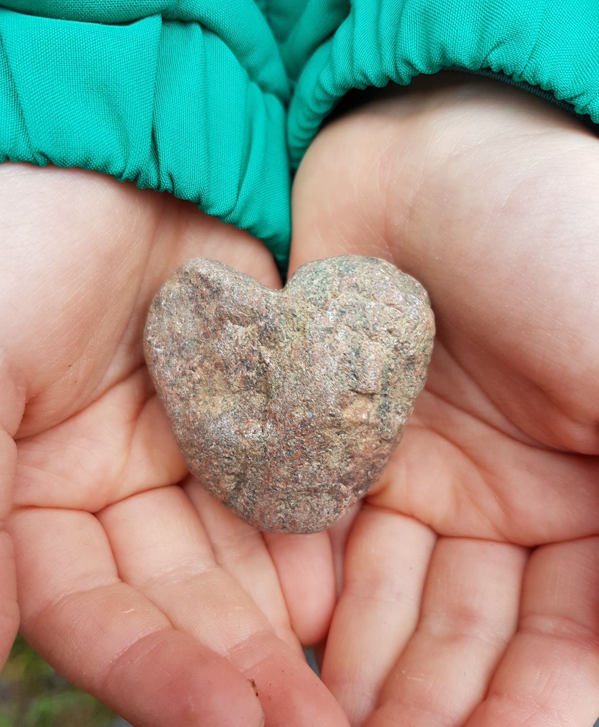Tämän kiven löysi 5-vuotias poikamme viikottaiselta metsäretkeltämme. Kivi tarttui heti matkaan, kulki tiukasti kädessä ja päätyi hänen kivikokoelmaan, johon pääsevät vain harvat ja valitut, vuosien ajalta kerätyt erikoiskivet.