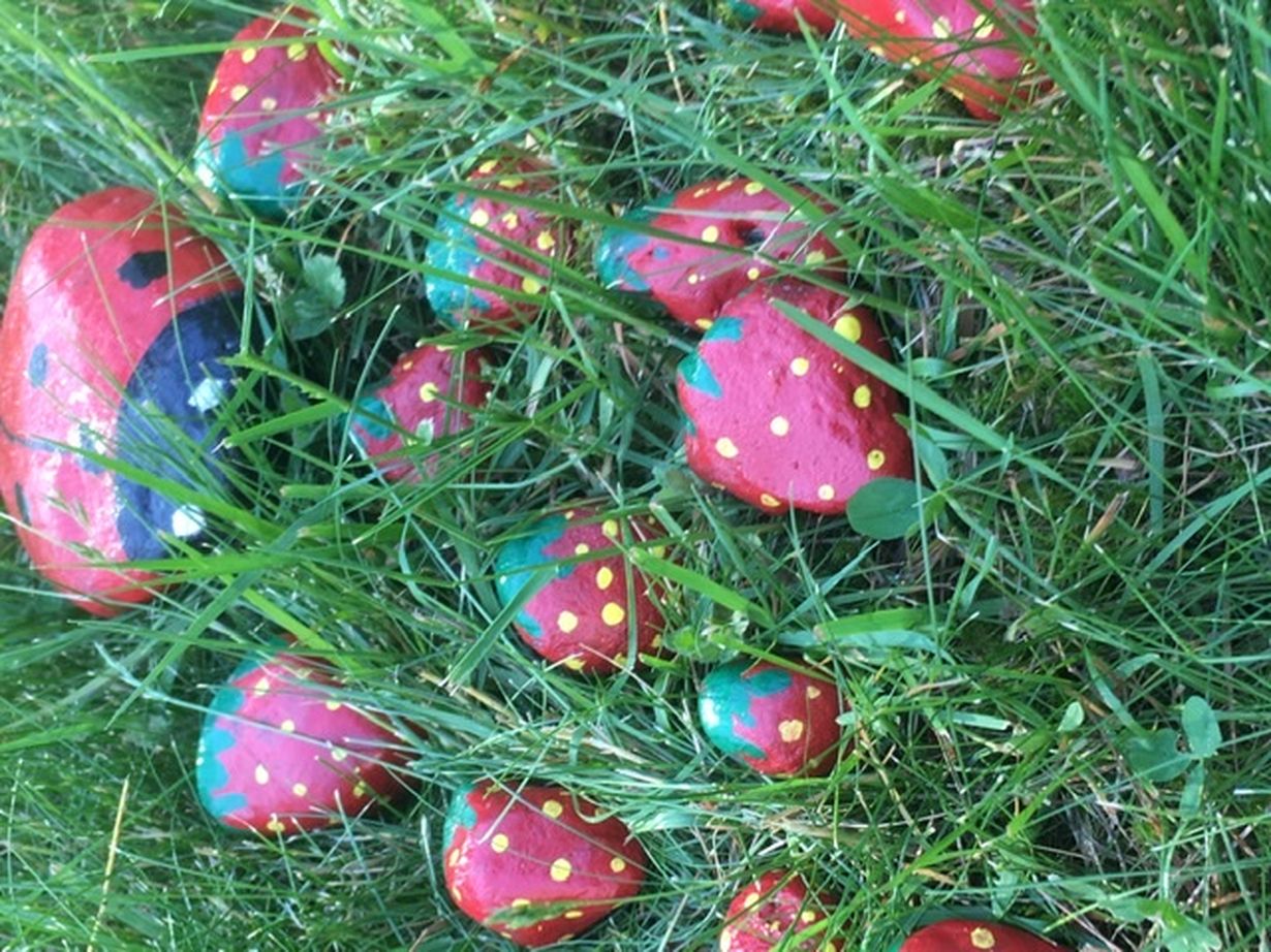 Vanhempani uusivat pienen mansikkamaansa ja valittelivat rastaista jotka syövät mansikat. Tein lintujen hämäämiseksi muutaman kivimansikan ja vielä yhden isomman itselleni. Mukavaa hellepäivän puuhaa varjossa.