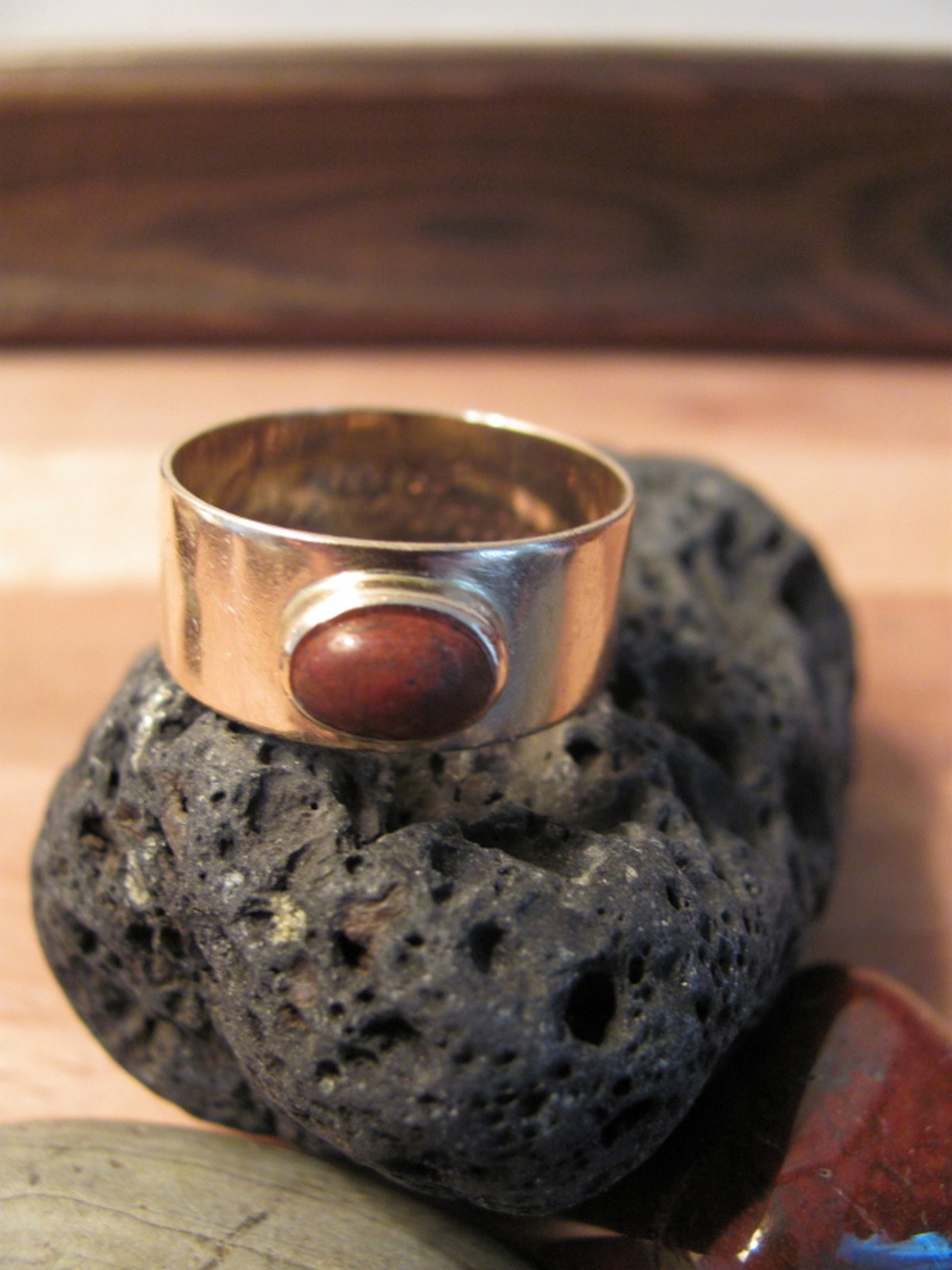 Äitini rippisormuksesta geologi-isäni teetti kaikille tyttärilleen sormukset. Osa sai sen rippilahjaksi, osa valmistuessaan ammattiin. Äidin sormuksessa kivi on ruusukvartsi, mutta meillä tyttärillä jaspis. Halusin kuvata sormuksen lipastoni päällä olevan "kivikokoelman" päällä, jossa on aivan äskettäin isältä saamani hieno, hiottu jaspis. Joskus ihmiset tunnistavat minut ja siskoni siskoksiksi sormuksen perusteella. Rakastan sormustani tosi paljon ja pidän sitä oikeassa nimettömässäni yötä päivää.