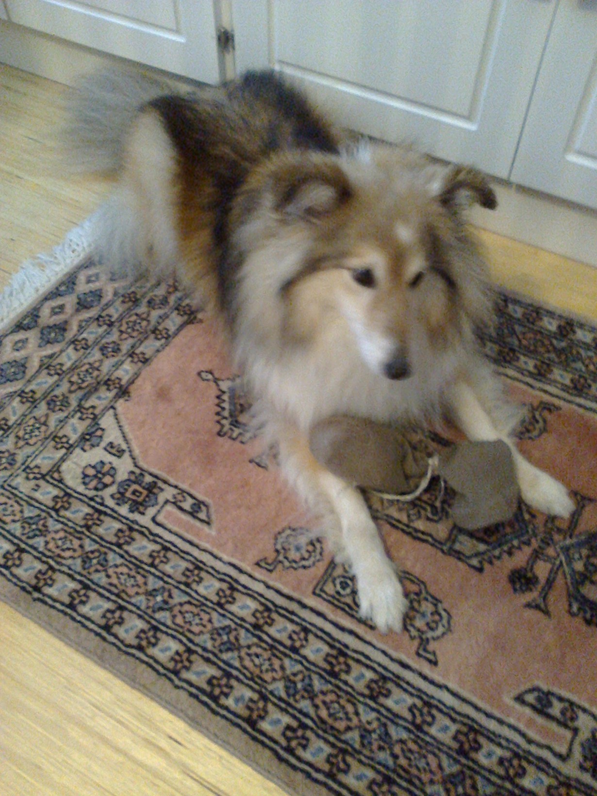 Muutamasta sukkaparista kehitelty heittelyn ja pureskelun kestävä lelu, joka tuntuu käytössä mieluisalta. Vyönauha/- naru vaihdettu tarpeen mukaan.