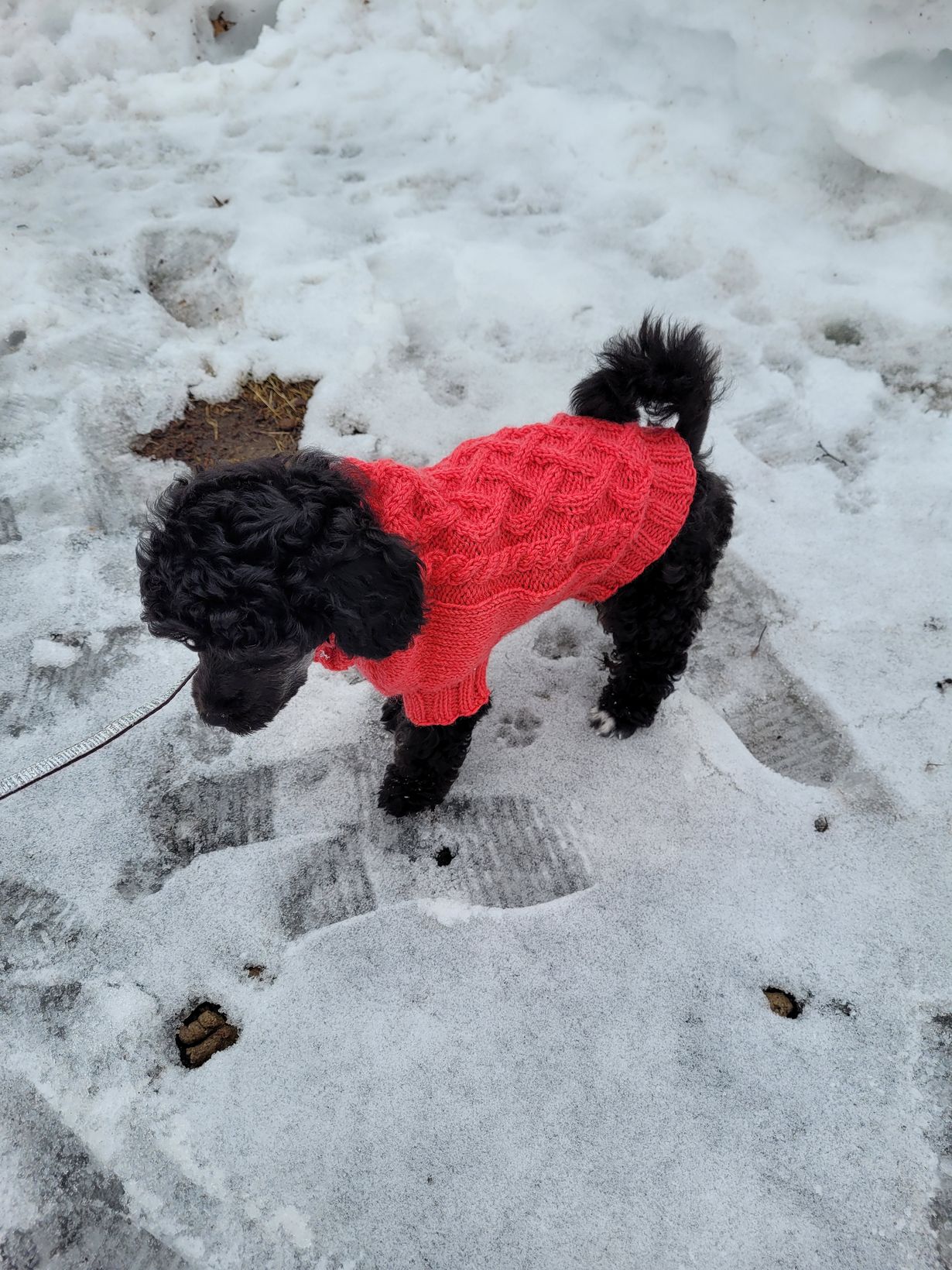 Meille tuli keväällä 2022 koiranpentu. Villakoiralta puuttuu aluskarva ja vauvaparalla tuli herkästi vilu. Tarpeeksi pikkuruista koiranvaatetta ei aluksi pennulle meinannut löytyä, mutta parissa päivässä oli omin käsin tehty villapaita valmis.
