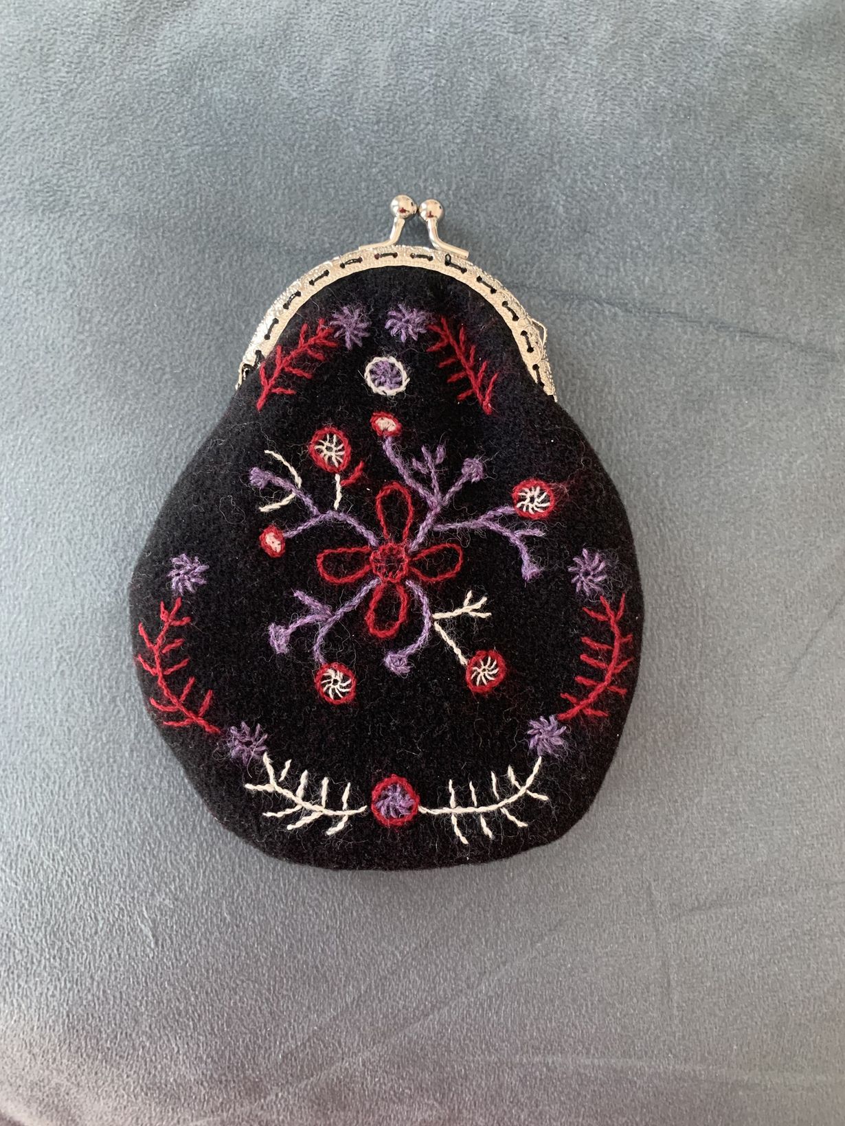 Tämä itse tehty villakankainen, villalangalla kirjottu kukkaro kulkee aina mukana ja kolikoiden lisäksi siihen mahtuu yhtä ja toista tarpeellista.
