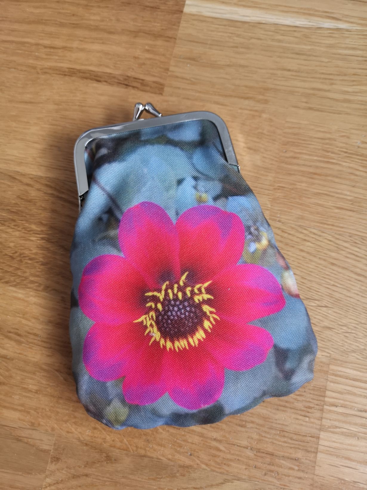 Tämän kauniin kukkaron on hyvä ystäväni teettänyt itse ottamastaan valokuvasta. Sen sisälle mahtuu paitsi kolikoita, myös pieni kampa, huulirasva ja hammastikkurasia. Täydellinen käsilaukun apu siis!