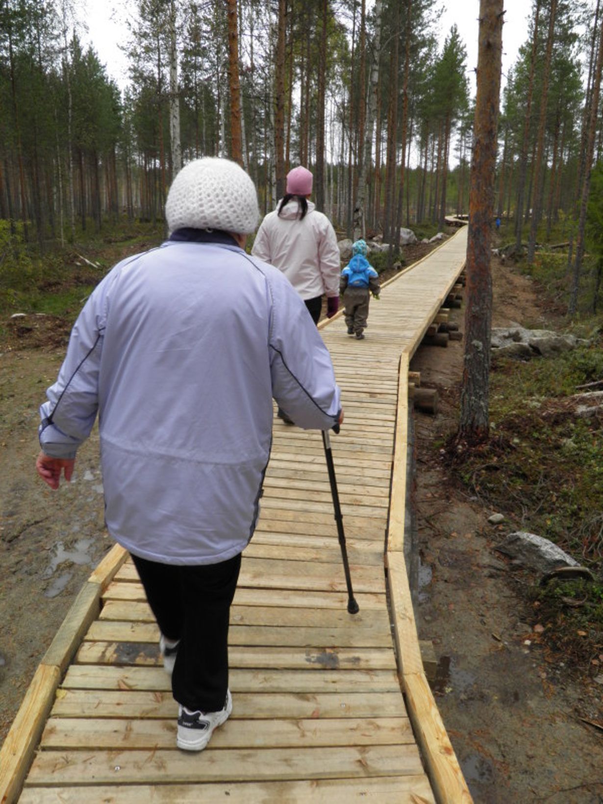 En ole itse äiti (vielä), joten en ole saanut äitienpäiväkorttia. Kuvassa on oma äitini, siskoni ja tämän 3-vuotias poika metsäretkellä. Eri tahtiin mennään kolmessa sukupolvessa, mutta määränpää on sama.