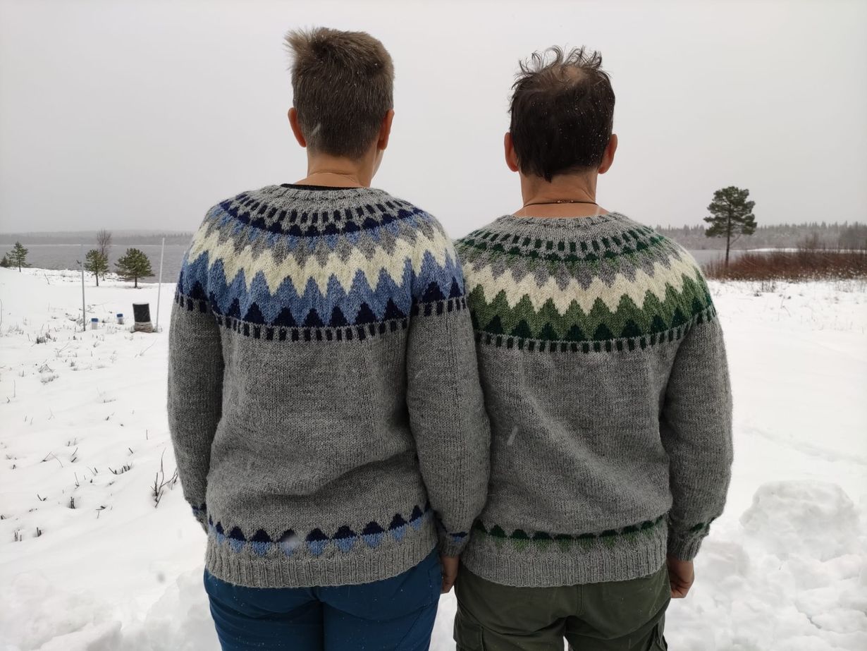 Ajeltiin syysloma viikolla Seinäjoelta Leville, perille päästyämme tyttärellämme oli meille lahjat, komiat itsekudotut villapaidat, äidille sininen, tietysti ja iskälle vihreä, lempivärit käytössä
