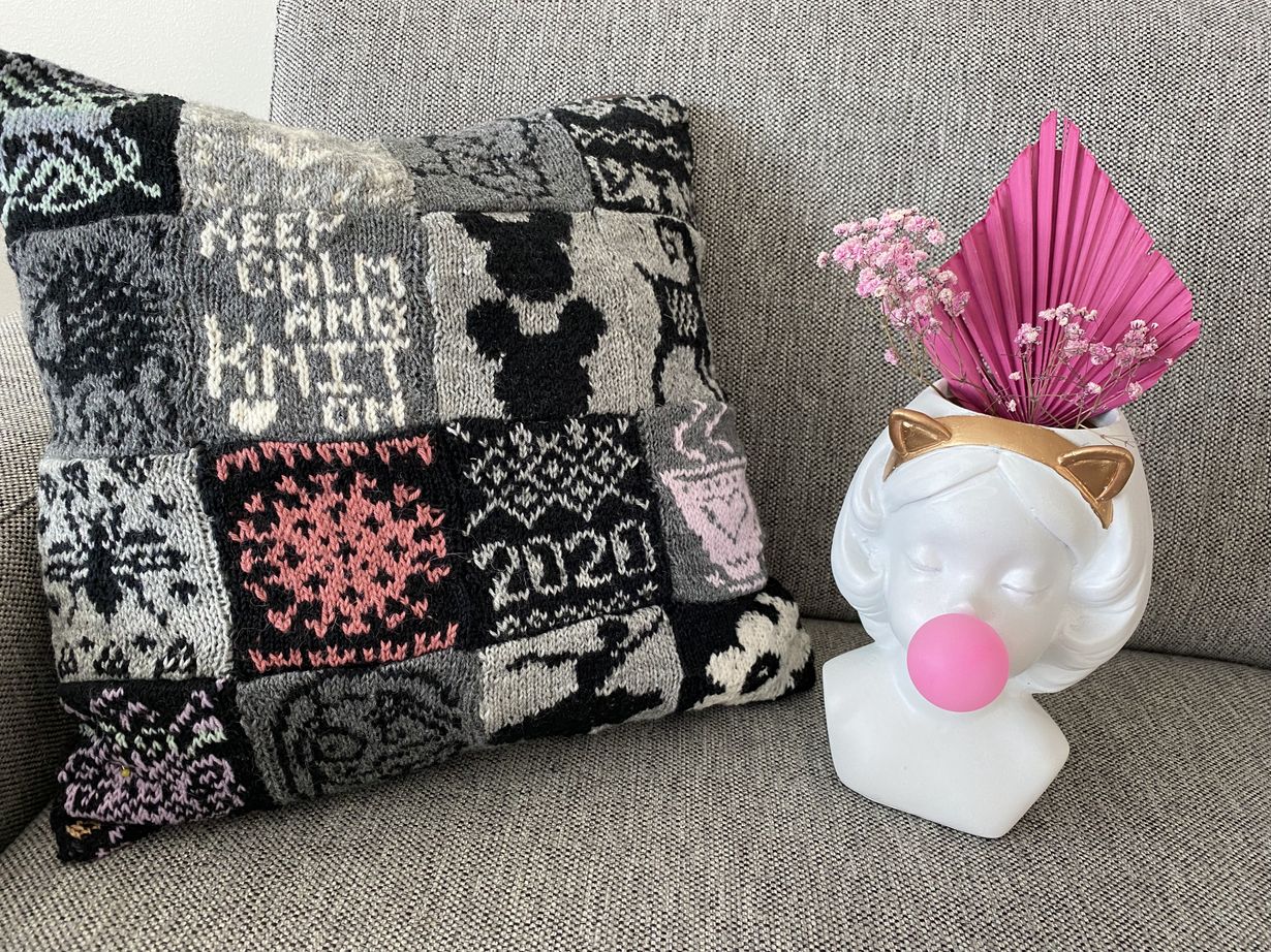 Korona aika ja kotona olo lisääntyi, kaivoin lankalaatikosta kerien jämiä ja aloin neulomaan pieniä neliöitä. Kuviot piirsin netin syövereistä kaivetuilta kuvista itselle talteen neulevihkoon, niin sai tämä tyynynpäällinen alkunsa. Vasta nyt tänä keväällä sain koottua neliöt tyynyksi.