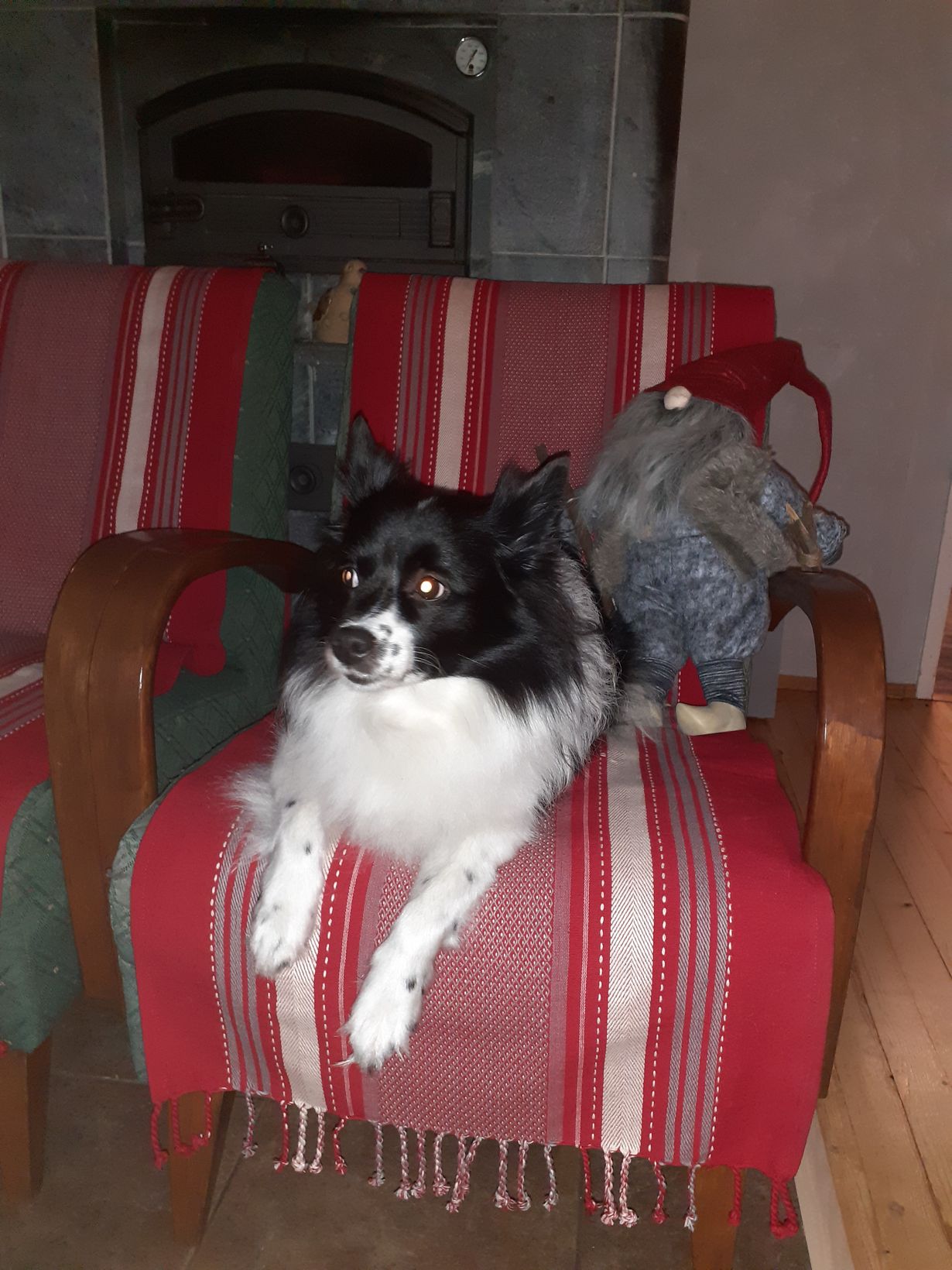 Korona-ajan pukki Riitu-koiran kanssa. Riitu onkin oikean pukin hyvä kaveri. Oli viime jouluna pettynyt, kun pukki ei päässyt vierailulle. Toivottavasti tänä jouluna!