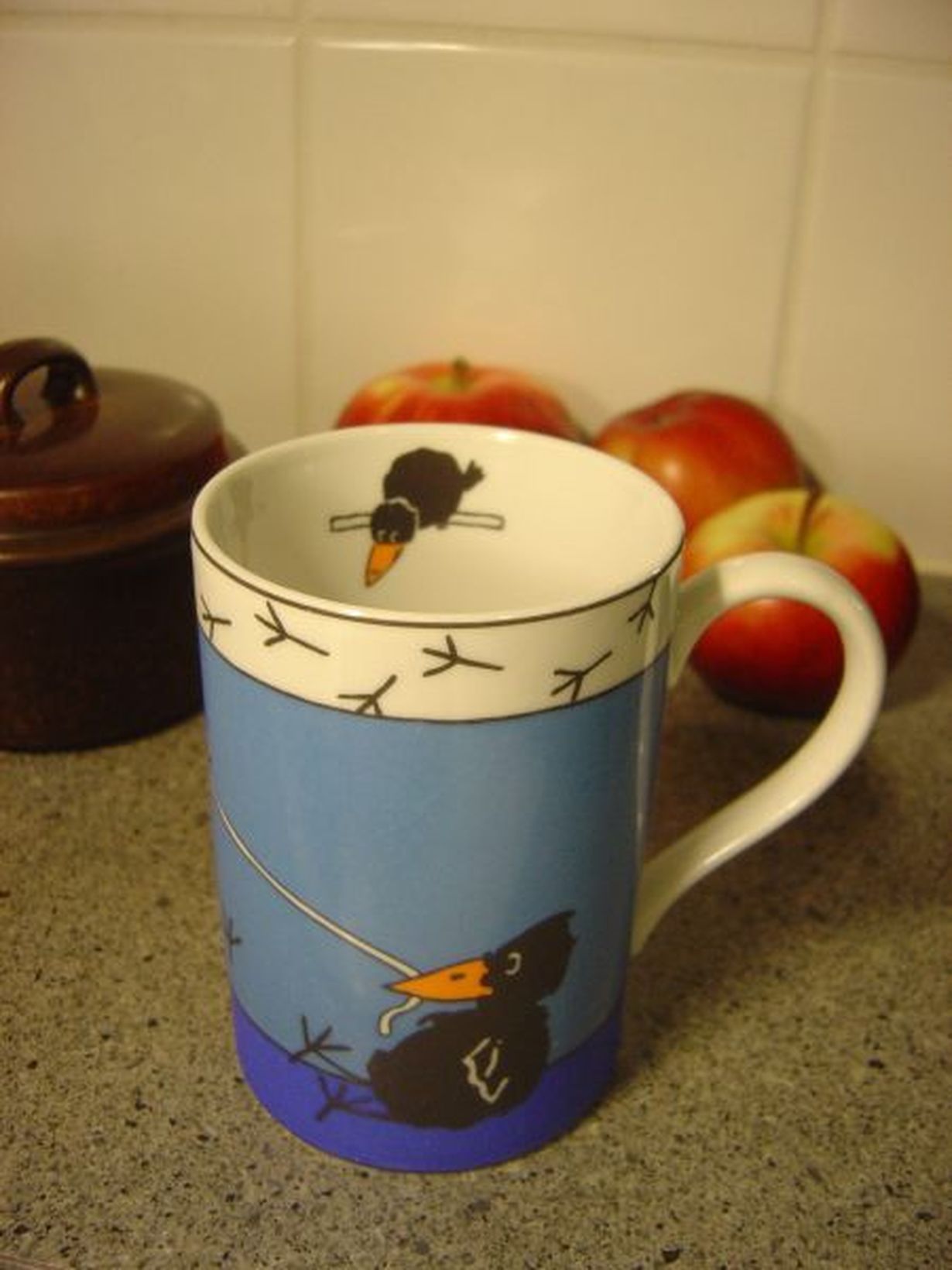 Olen saanut korppikupin lahjaksi poikaystävältäni, joten se on minulle tärkeä. Ihastuin oitis veikeisiin korpinpoikasiin (ehdottomasti korppeihin, vaikka nokat ovatkin oranssit!), jotka kiertävät mukia, kaksi niistä madosta kiistellen. Yksi korpinpoika kurkistelee kupin sisälläkin! Paitsi kaunis, kuppi on myös käytännöllinen; kahvia mahtuu siihen juuri sopiva määrä, ja juoma pysyy kuumana.