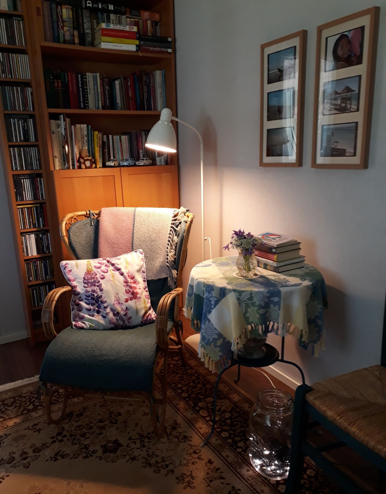 Tässä oli aiemmin kuntopyörän paikka. Kun se alkoi toimia enemmän lenkkivaatteiden henkarina kuin kuntoiluvälineenä, pyörä lähti kierrätykseen ja siirsin sen paikalle vanhan korituolin, jossa iltaisin luen jonkun aikaa ennen nukkumaanmenoa. Tällä hetkellä iltalukemisena on Johanna Holmströmin hieno "Sielujen saari".
