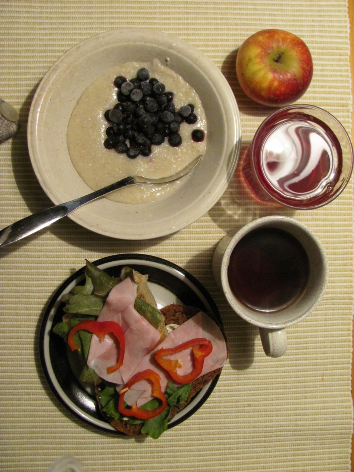Aamiainen sisältää kattilassa keitettyä kaurapuuroa metsästä poimittujen pakastemustikoiden kera, teetä, ruisleivän ja täysjyväleivän, kotimaisen omenan sekä puutarhan marjoista keitettyä viinimarjamehua. Nautitaan oman pirttipöydän ääressä ennen töihin lähtöä.Tällä jaksaa mainiosti lounaaseen asti.