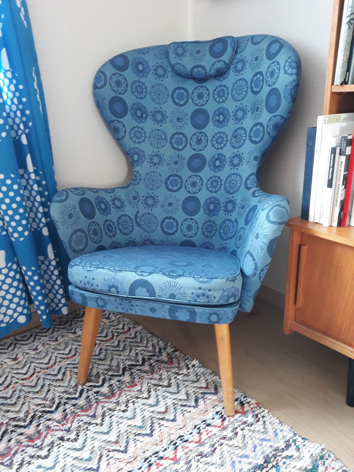 Sain tuolin lahjaksi äidin miesystävältä. Se oli peräisin hänen edesmenneeltä äidiltään ja paljastui suomalaisen muotoilija Carl-Gustaf Hiort af Ornäsin suunnittelemaksi. Tuolin superlon-sisustus oli vuosikymmenten saatossa kovettunut koppuraksi mutta sininen verhoilukangas oli priimakunnossa. Taitava verhoilija vaihtoi fyllingit ja tuoli pääsi taas käyttöön. Ehdoton lempihuonekaluni!