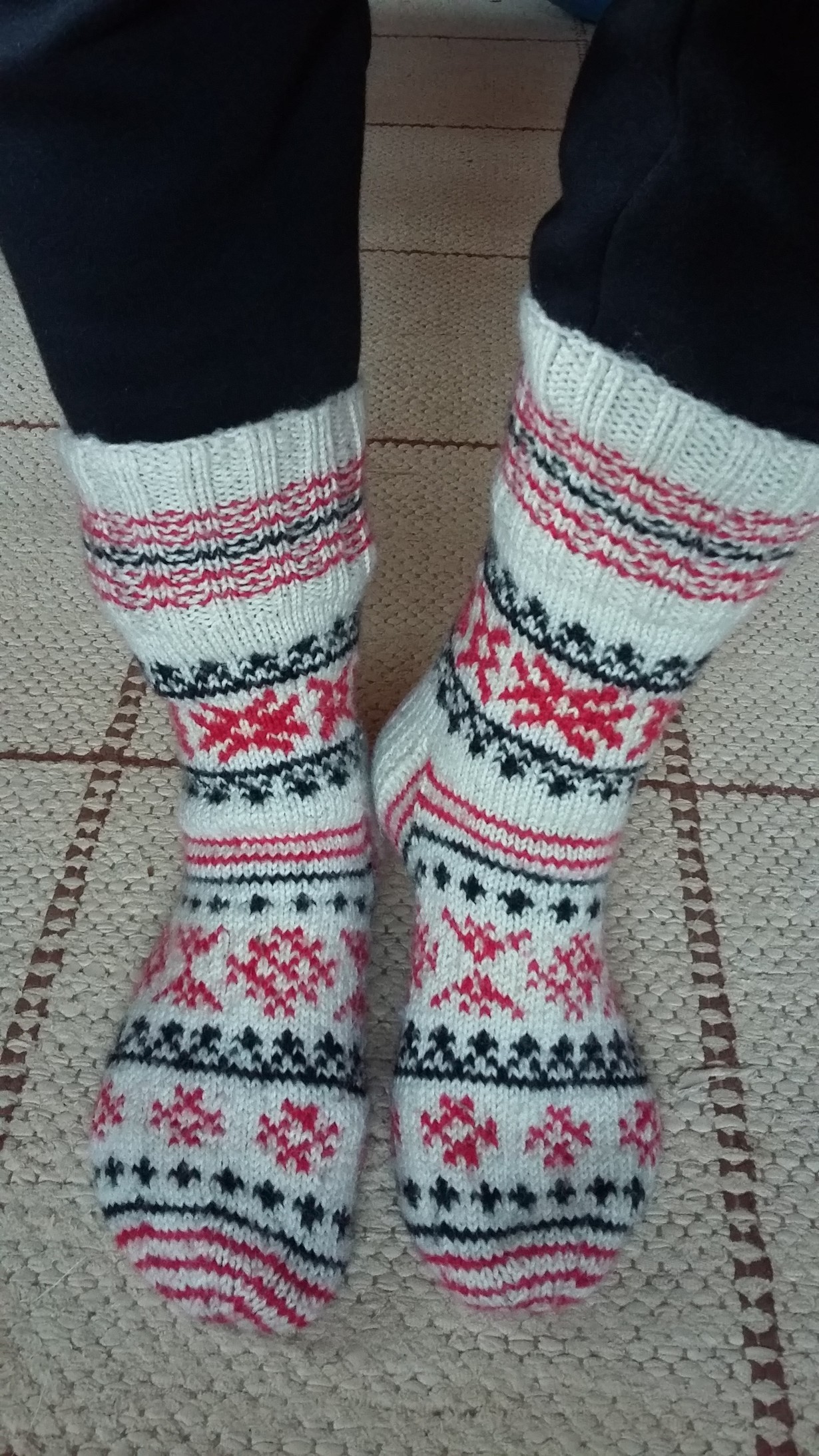 Muutin Pohjois-Karjalasta länsirannikolle töiden perässä. Koti-ikävän iskiessä rupesin lukemaan Karjalan historiasta ja perinteistä kertovia kirjoja. Perinteisten käspaikkojen kuosien innoittamana suunnittelin itsellini koti-ikävä-lohtu-sukat.