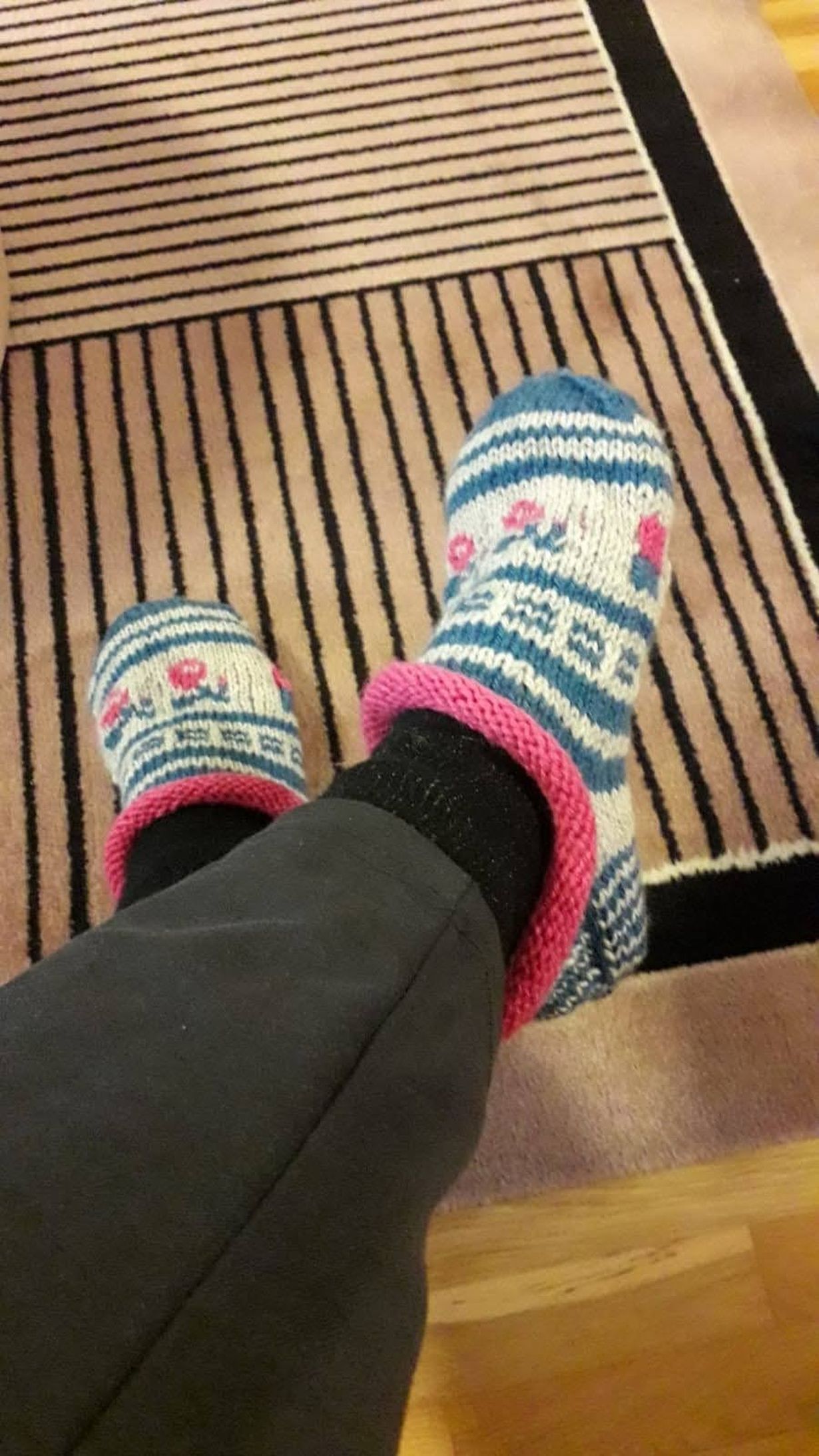 Unisukkien ohjeella tein kotitossut ystävälleni. Kuvion suunnittelin itse ja langan vaihdoin kestävämpään ja tein pohjat kaksinkertaisina niin kestää tassutella.