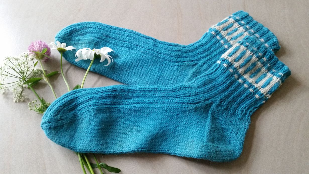 Kansakoulun 4. luokalla olen nämä sukat kutonut ja jääneet ainoiksi sukikseni. Ovat vielä alkuperäisessä kunnossa, prässättynäkin. Varsi on haasteellinen, kiristää sen verran etteivät oikein jalkaan mahdu.. Muistelen Anja-opettajaa silti lämmöllä. Muu suku kutoo minua enemmän joten sukkia piisaa!