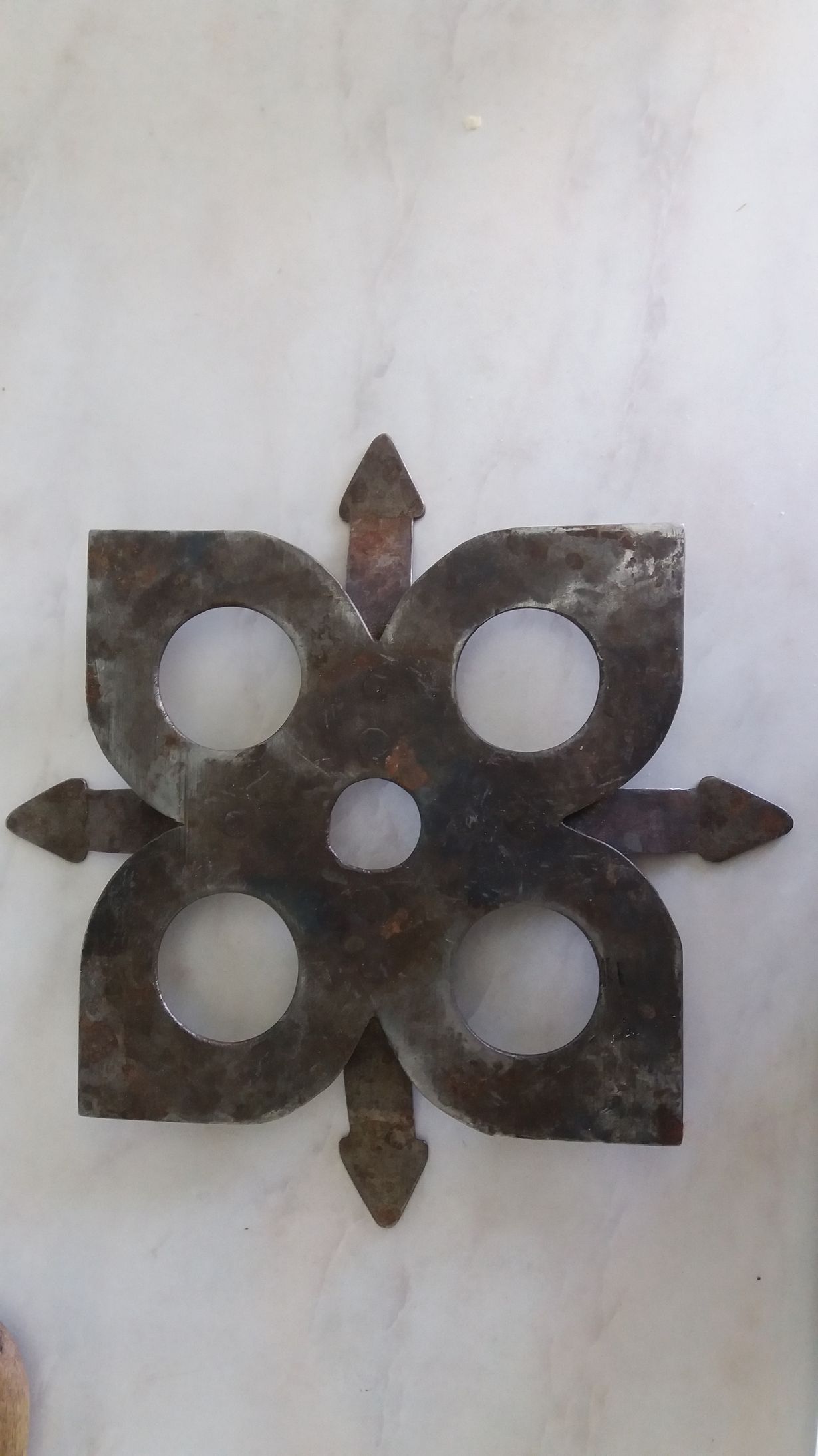 Tämä on mieheni seitsemännellä luokalla tekemä metallinen pannunalusta. Se on ollut käytössä vuodesta 1968 ensin anoppilassa ja meillä vuodesta 1999.