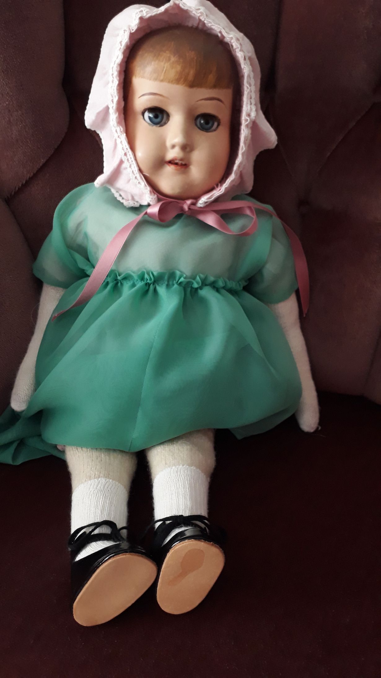 Tässä istuu äitini vuonna -46 tekemä Annele-nukke. Äiti oli tuolloin 12 -vuotias. Hattu ja sukat ovat alkuperäiset,mekko uusittu n.30 vuotta sitten