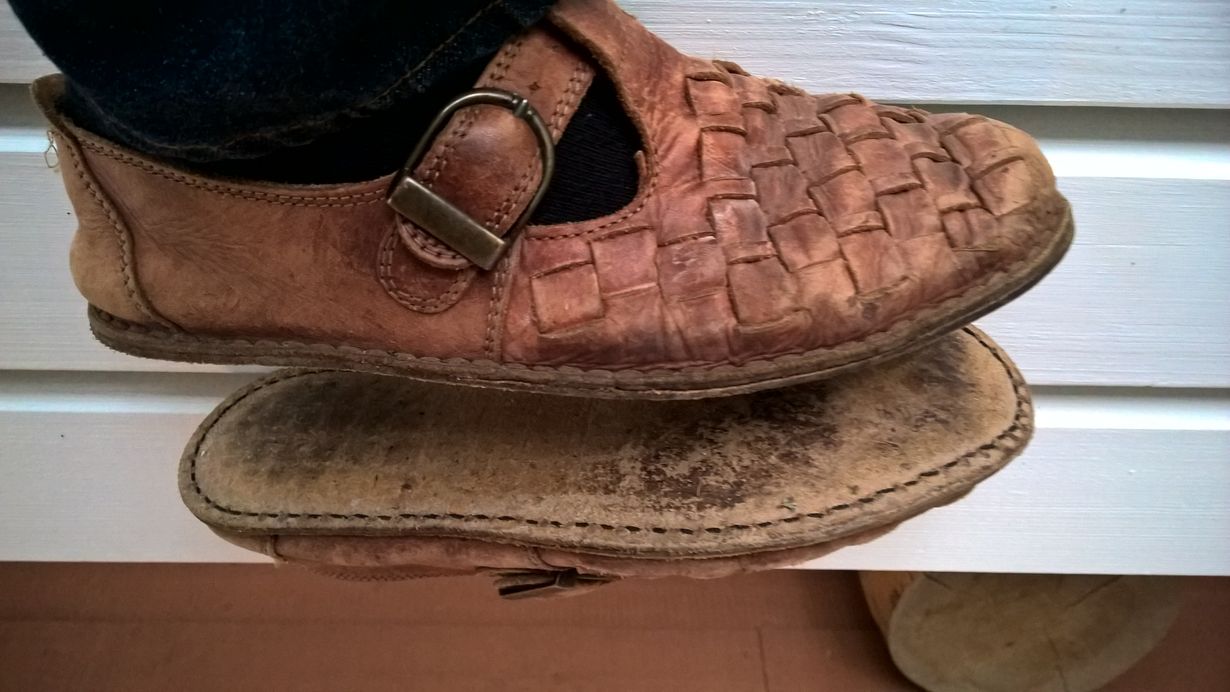 Näistä ykkössandaaleista tuli jo ajat sitten mökkikengät. Kovat pohjat irtosivat, nyt vain nahkaa. Käpy polulla ei tunnu hyvältä... Kevyet!
