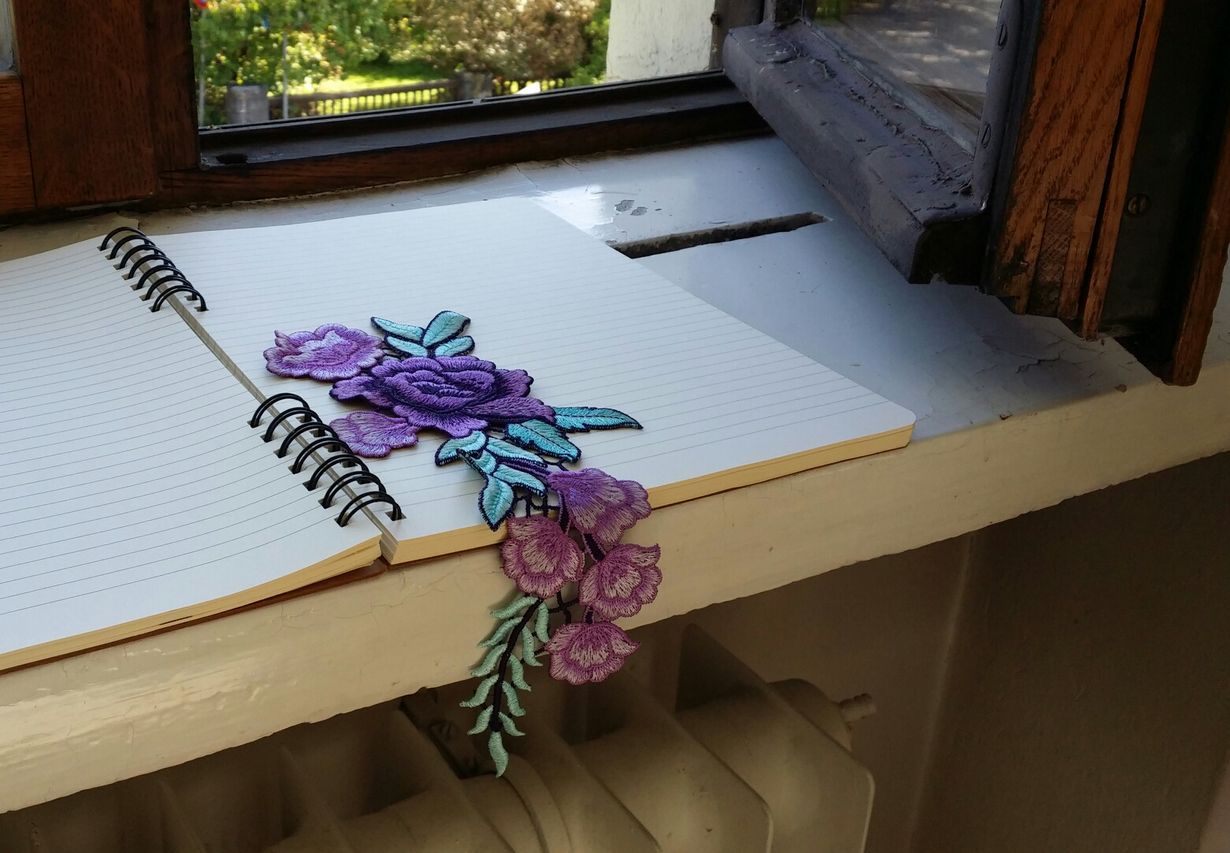Kirjan välistä kasvaa kaunis kukkainen köynnös. Kyseessä on oikeasti kirjonta kuvio, jonka ystäväni antoi minulle lahjaksi. Aluksi ajattelin kiinnittää sen reppuuni, mutta lopulta se onkin löytänyt paikkansa erilaisten kirjojen välistä.