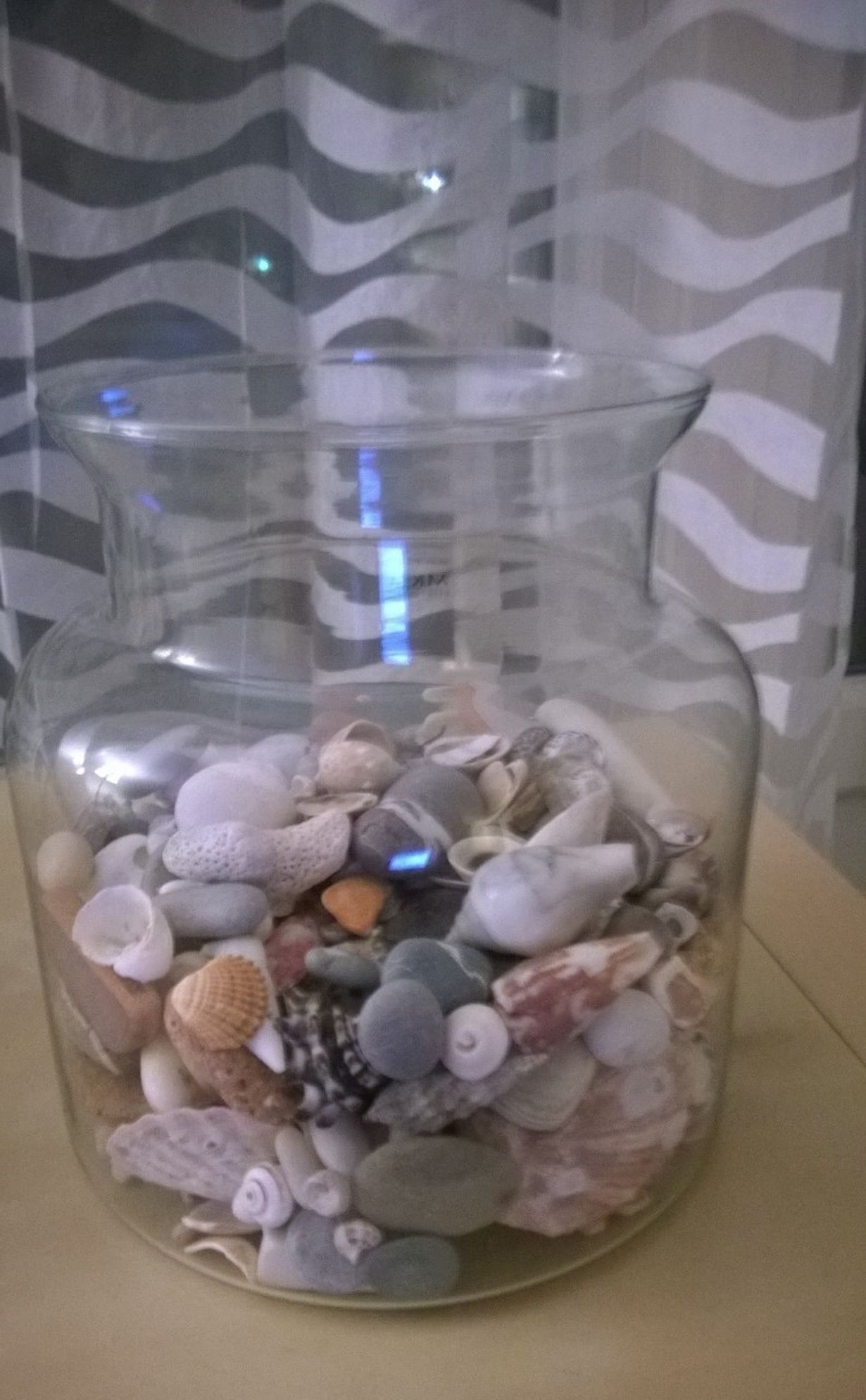 Tähän lasiastiaan on tallennettu monet ihanat hetket Kreikan kuuman auringon alla . Pikkupoikani rakasti kävellä rantahiekalla ja etsiä aarteita...kiviä ja merenlasia ja simpunkankuoria.Tätä matkamuistoa katsoessa melkein kuulen aaltojen laulun ja näen pienen pojan hiekkaisen käden joka ojentuu äitiä kohti paljastaen kämmenellä kiiltelevän aarteen :-)