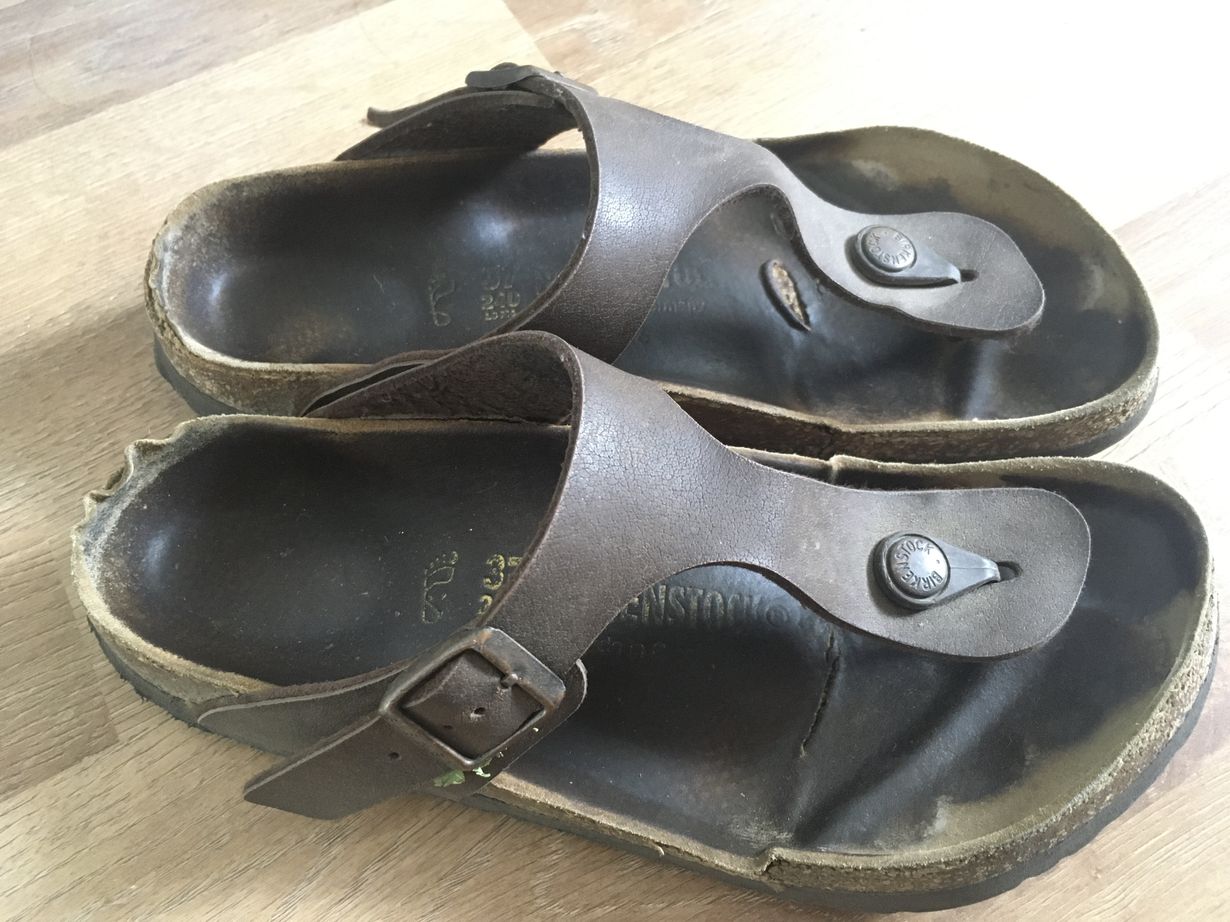Noin 8 vuotta vanhat sandaalit, joita olen käyttänyt kesäisin jatkuvasti. Ovat muovautuneet jaloilleni täydellisiksi, mutta nyt pohjiin on tullut halkeamat ja nahka on rullautunut, niin että painavat jalkapohjiini ikävästi. Myös pohjat aivan sileiksi (ja vaarallisen liukkaiksi) kuluneet. Mietin kuitenkin, saisiko kengät vielä suutarilla kuntoon.