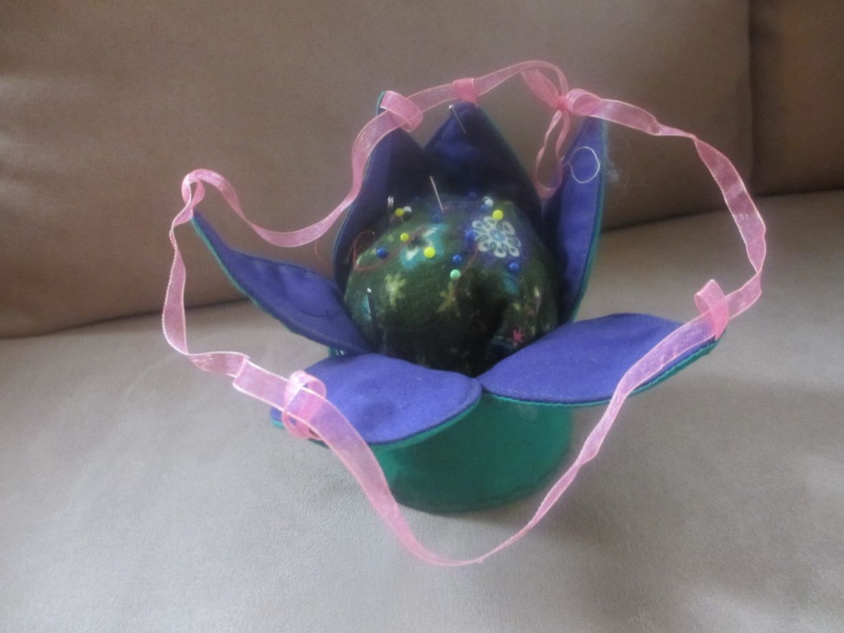 Päällystettyyn ananaspurkkiin tehty kukka-tyyny. Narut kiristämällä neulat saa jemmaan terälehtien sisään. Ohje saatu kurssikaverilta.