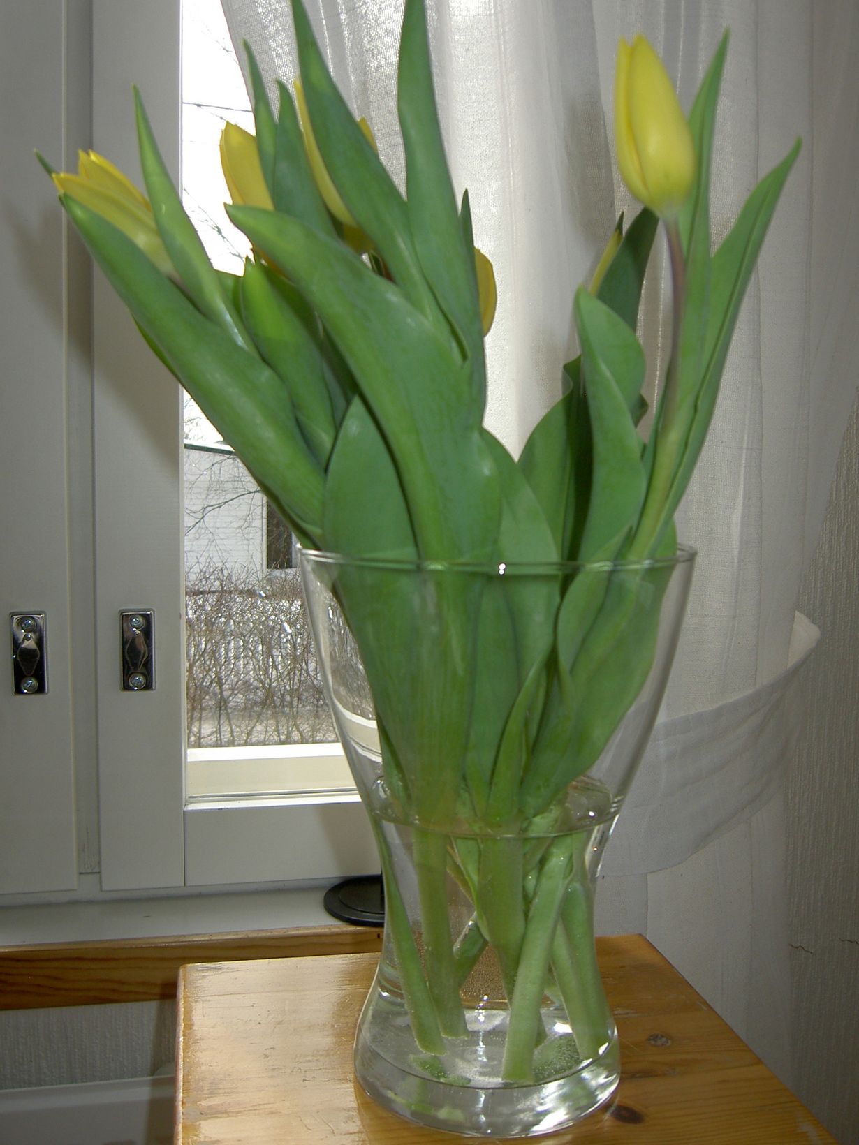 Kaappien kätköissä on jos jonkinlaisia vaaseja, mutta loppujen lopuksi pidän kaikkein eniten tästä yksinkertaisesta Ikean lasivaasista, joka päästää kukkaset oikeuksiinsa eli pääosaan.